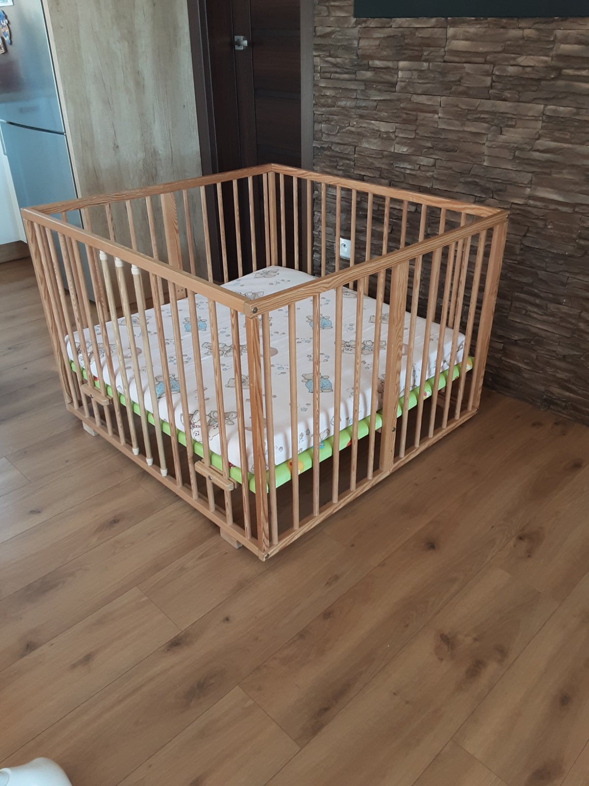 Ponúkam na predaj používanú drevenú ohrádku. Je výškovo nastaviteľná, má tri polohy. Tri šteblíky sa dajú vyberať. Pre lepšiu predstavivosť, ide v podstate o postieľku o rozmeroch 100x100 cm. Ohrádka má pevný rošt v dvoch kusoch. K ohrádke samozrejme nesmie chýbať ani matrac, asi vo výške 10cm. Na ohrádke sú vidieť aj známky používania ( je okúsaná). Ohrádku vrelo odporúčam, je nápomocná či už pri malom bábätku alebo staršom dieťatku. Bábätko si tam odložíte a možete pri ňom napriklad variť obed a nemusíte sa báť, že Vám spadne z gauča napr. Pri staršom dieťatku môžete vybrať šteblíky a ono si samo bude tam chodiť, či už oddýchnuť alebo si pôjde po dáku hračku. A v neposlednom rade nesmiem zabudnúť spomenúť kurierov. Dieťatko si tam " odložíte" na 5 minút a viete, že je v bezpečí. Či už si vyberiete moju ohrádku alebo inú, v každom prípade ju môžem len a len odporučiť.