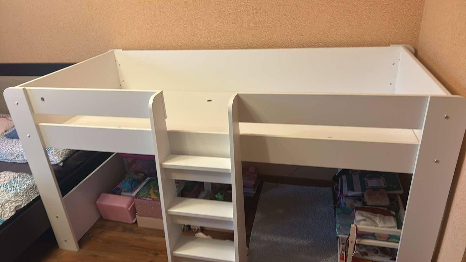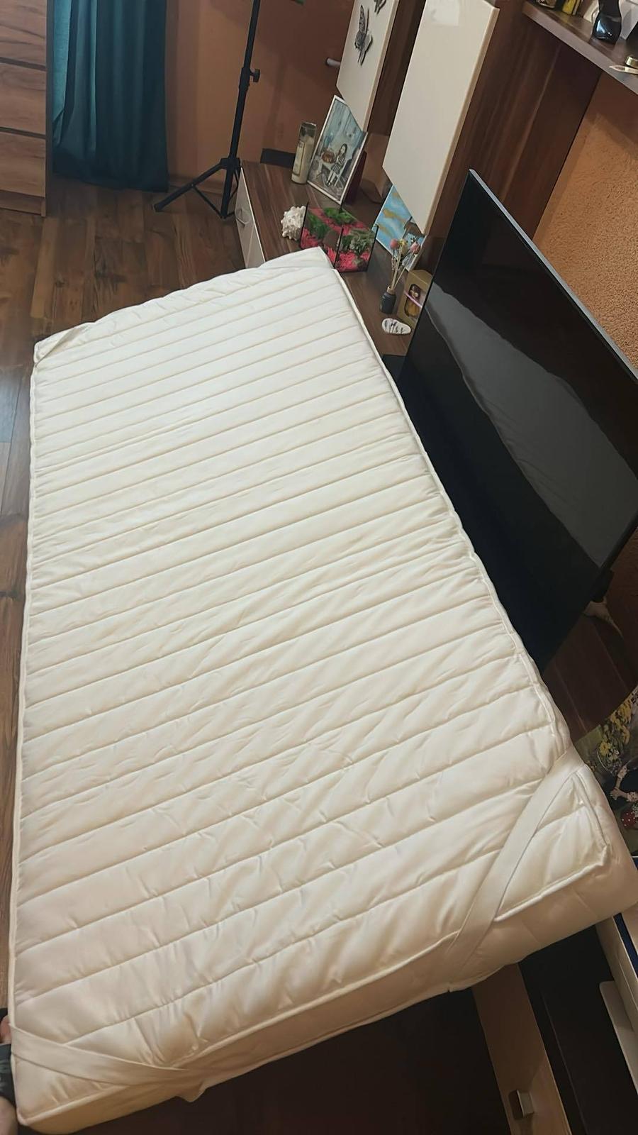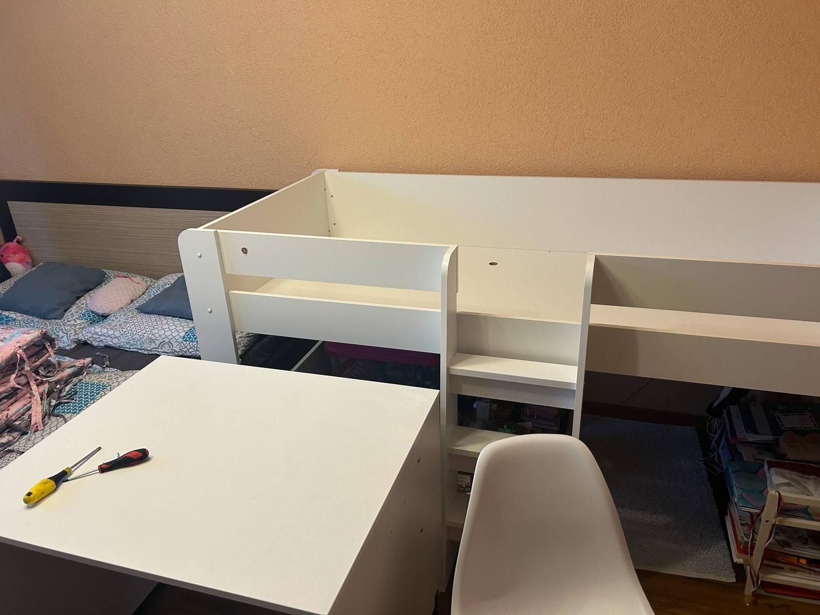Ponúkam na predaj ani rok nepoužívanú - ak tak len príležitostne, vyvýšenú posteľ s rozmerom 90x200cm, s matracom, ktorý je ako nový, ku posteli prináleží stolík na kolieskach, ktorý sa dá zasunúť pod posteľ a stolička - tieto tiež nepoužívané, všetko ako nové.
