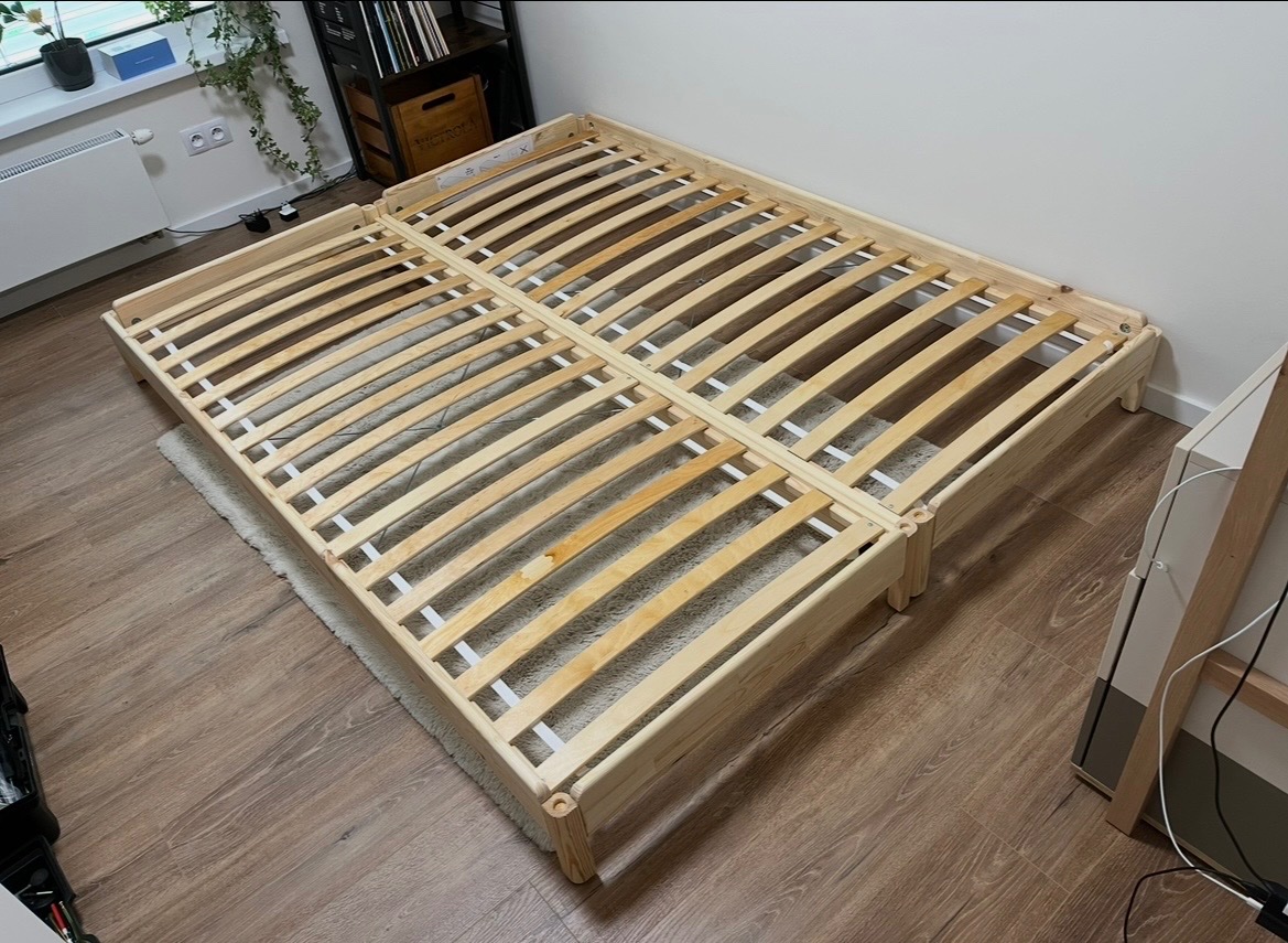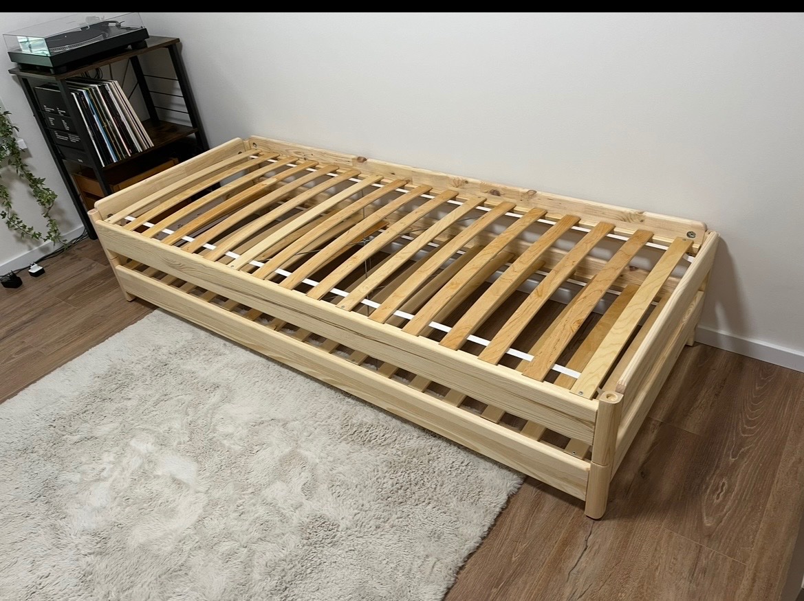 Posteľ bola umiestnená v hosťovskej izbe cca 2 roky. Používaná príležitostne. Bez poškodenia. Farba je prírodná, nelakovaná. Masívna borovica. Nosnosť jedného lôžka je 100kg. Preferujeme osobný odber v Bratislave. Posteľ pripravíme v demonte.