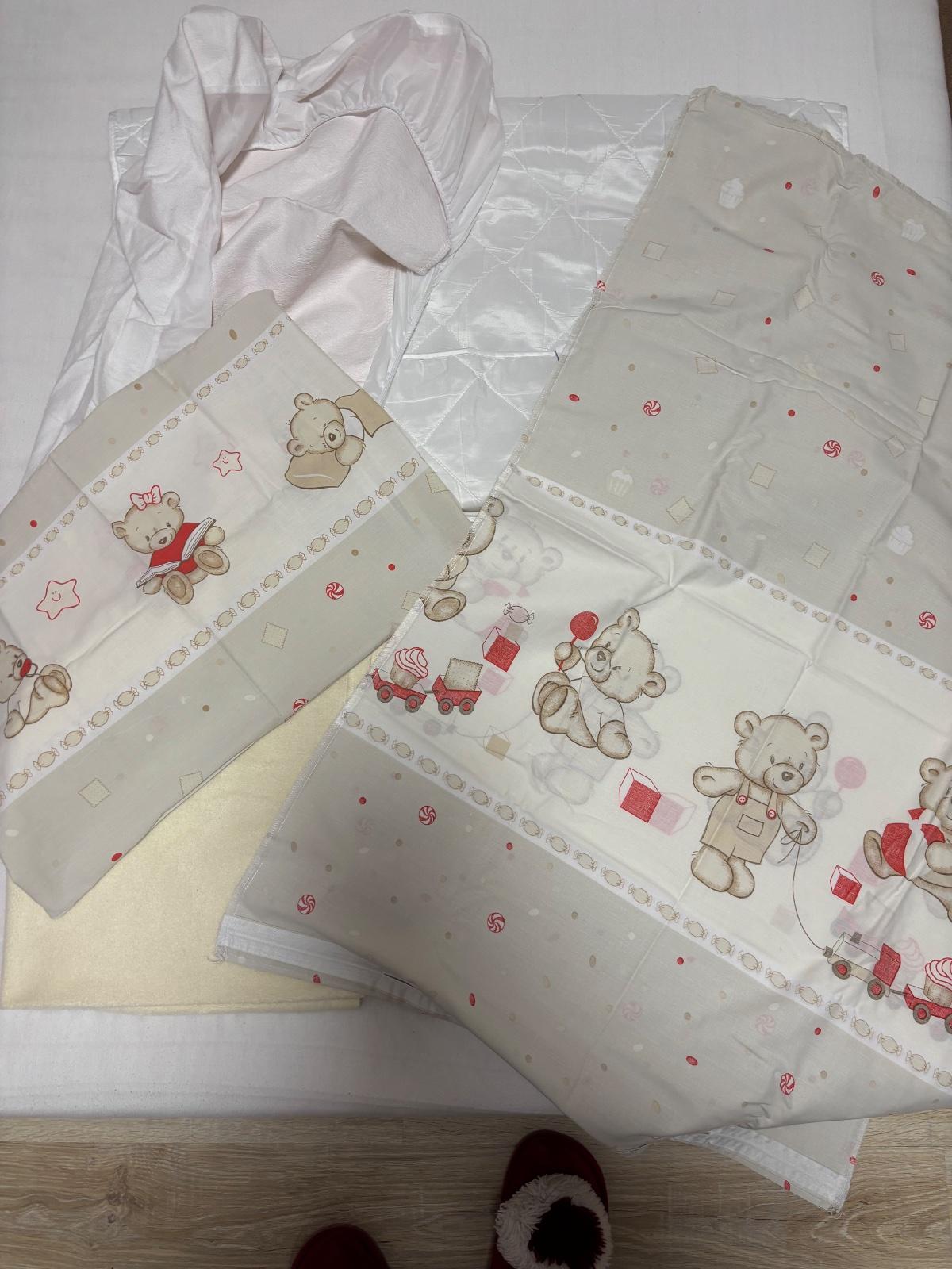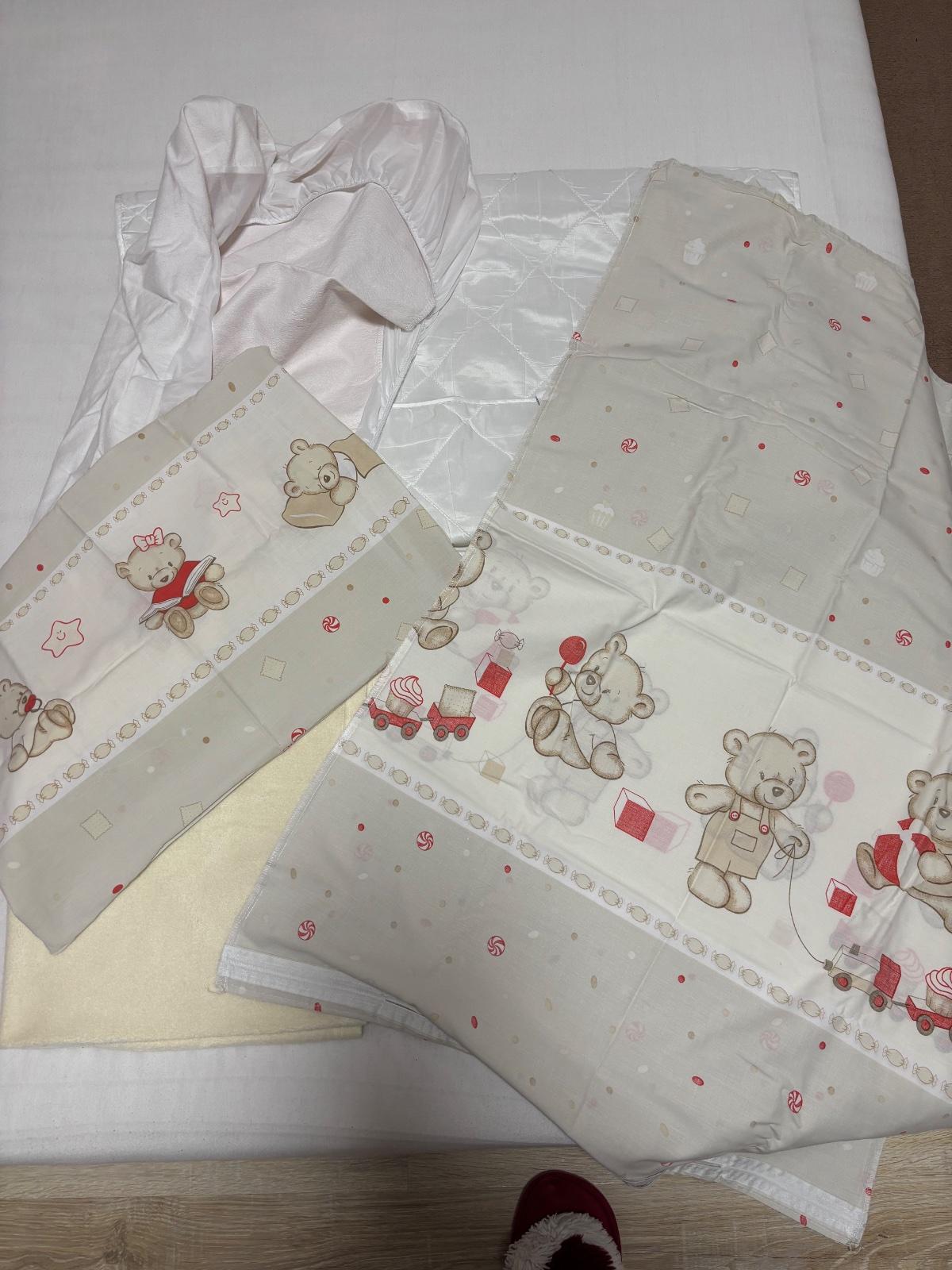 Malo používaná, pekná medvedíkoch súprava na vankúš, paplon. Vsetko spolu-nepremokava plachta, spodnú ochranu matraca, deku