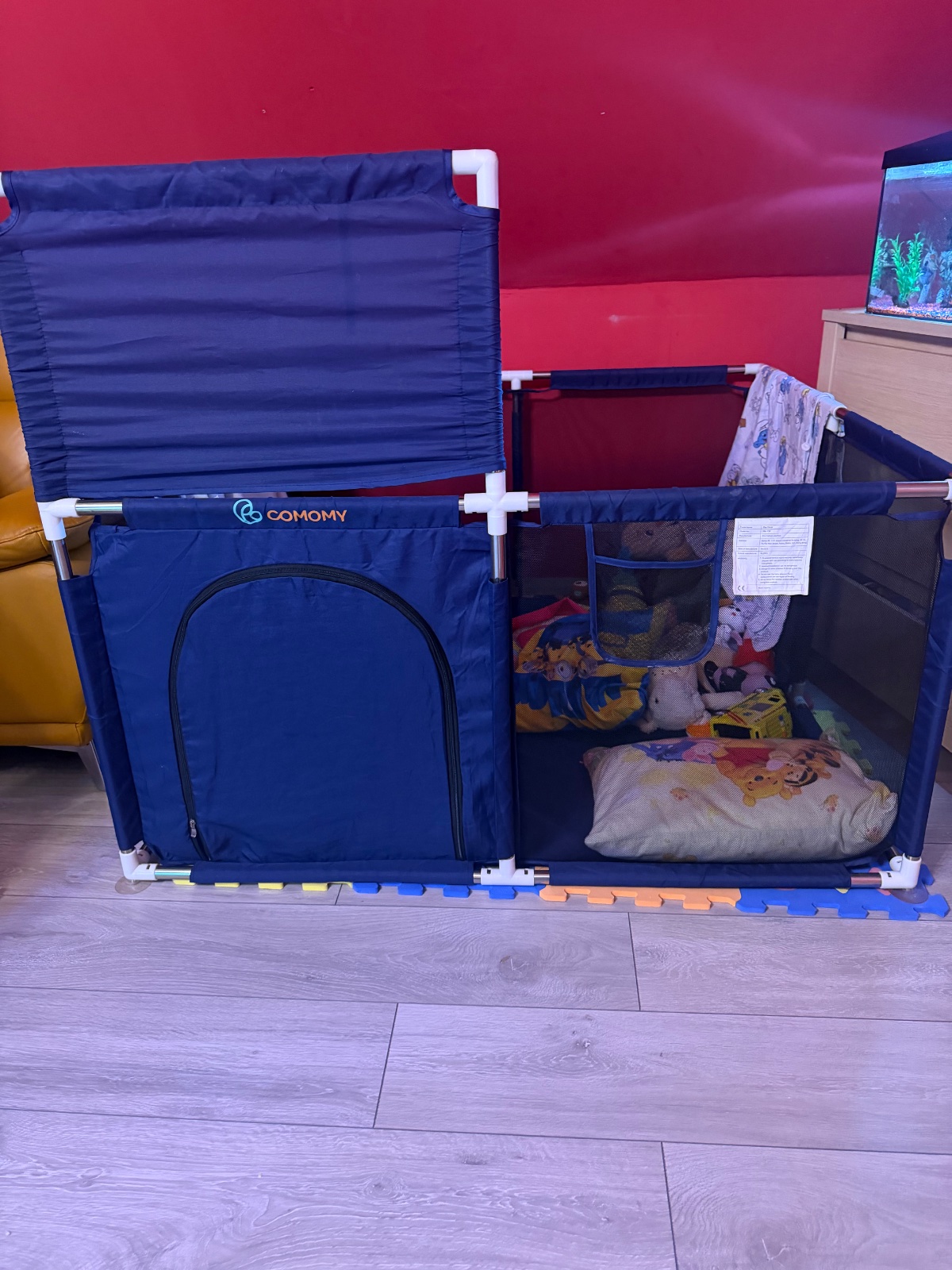 Posuniem detskú ohrádku zabudla som ju zmerať za zložená ked som ju merala tak jedna strana mala 130cm všetky 4 strany sú rovnaké má 2 chybičky utrhnuty kos na lopty dá sa našiť a nalomenu spojku nebráni to používaniu zips je funkčný :)