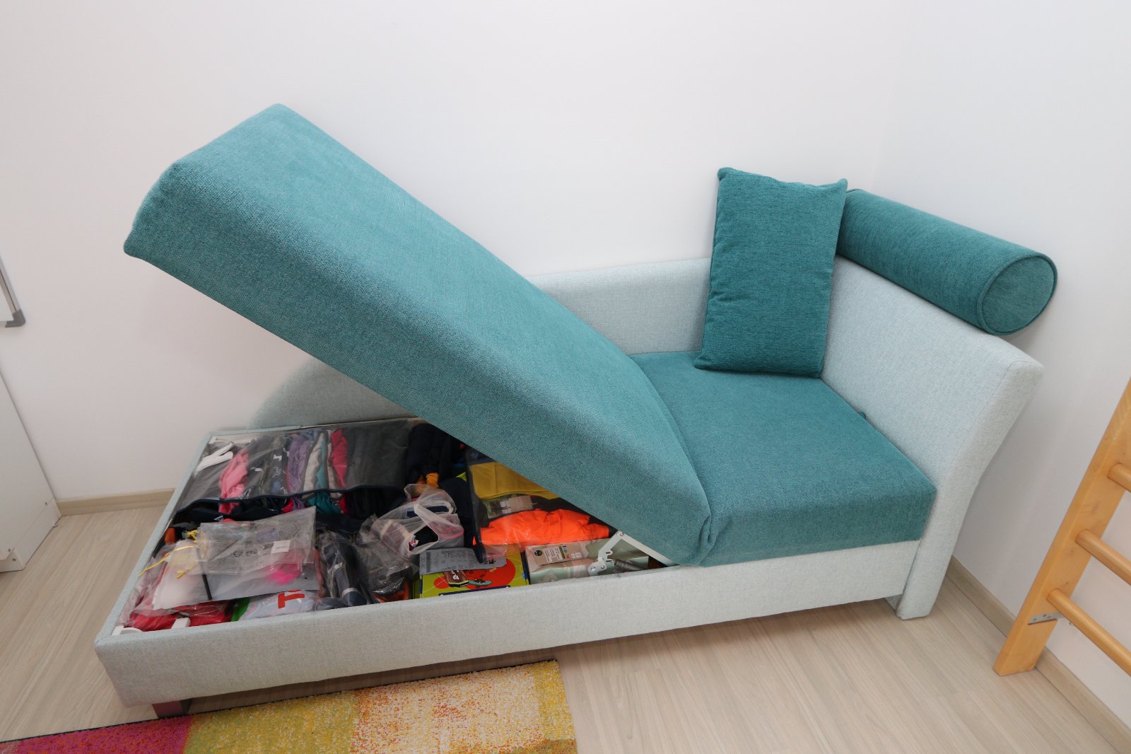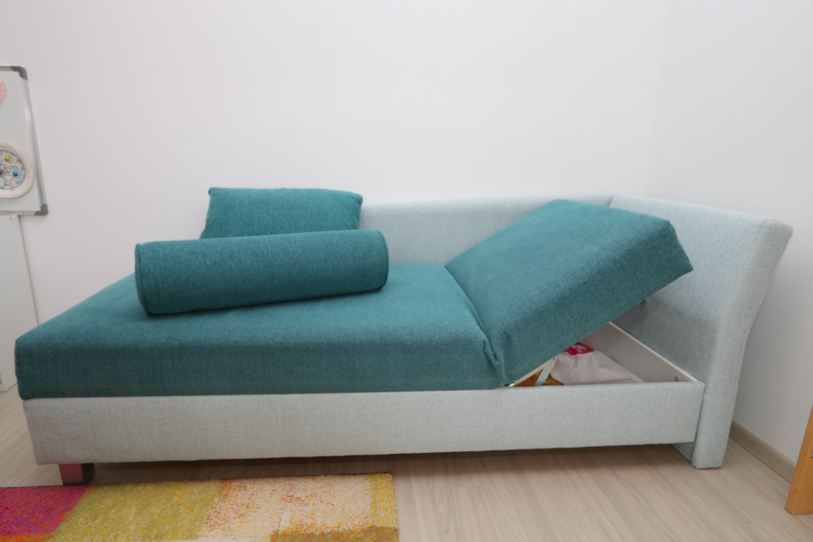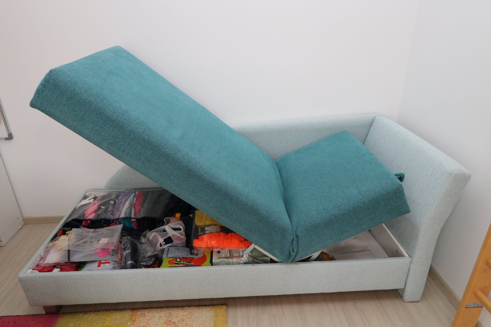 Predám polohovaciu sedačku Eley s úložným priestorom od slovenského výrobcu Fines. Môže slúžiť aj na spanie, má pružinový matrac, podhlavník sa dá zdvihnúť do rôznej výšky, má viacero polôh, v ktorých drží.