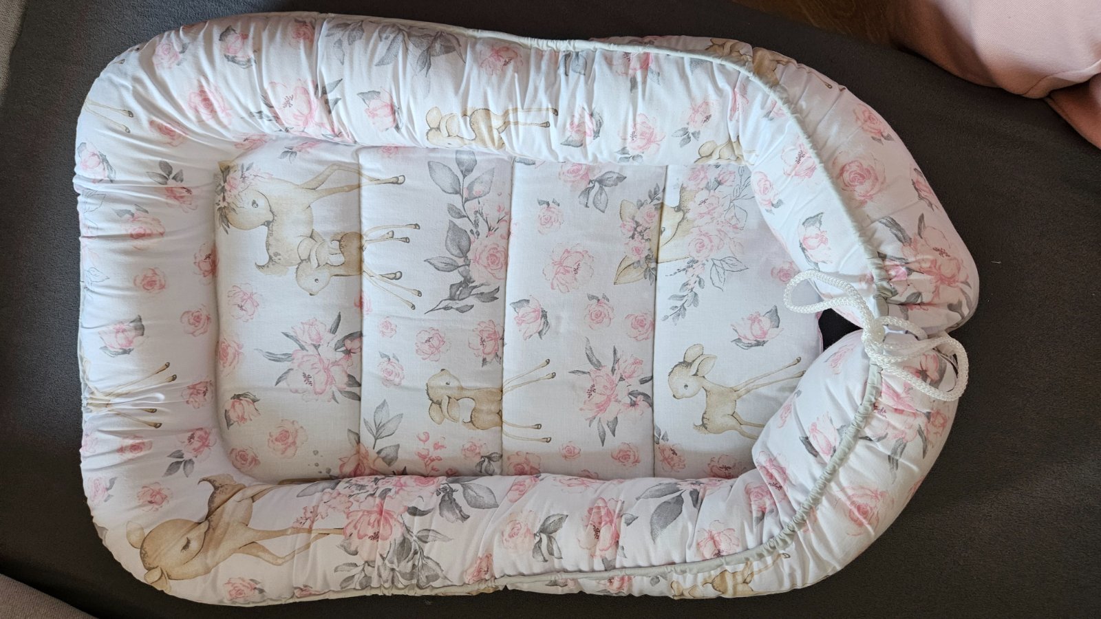 Ponúkam na predaj nové, nepoužívané vecičky zo zrušeného eshopu. Nové, nepoužívané hniezdočko s príslušenstvom. Je biele, s rozkošným jemným vzorom srnky a bledoružových ruží. Písaný rozmer je 55x85. K hniezdočku patrí aj mäkká podložka, dečka a obojstranný vankúšik v tvare motýlika.