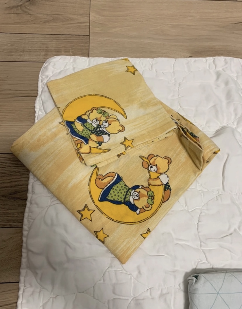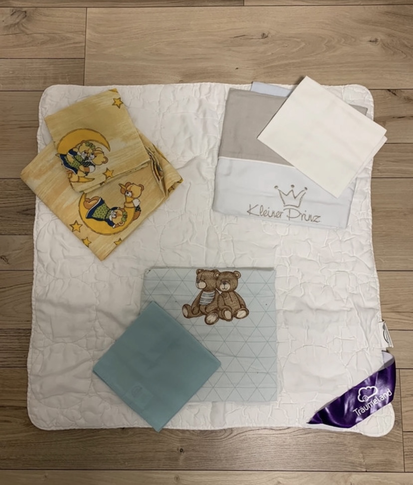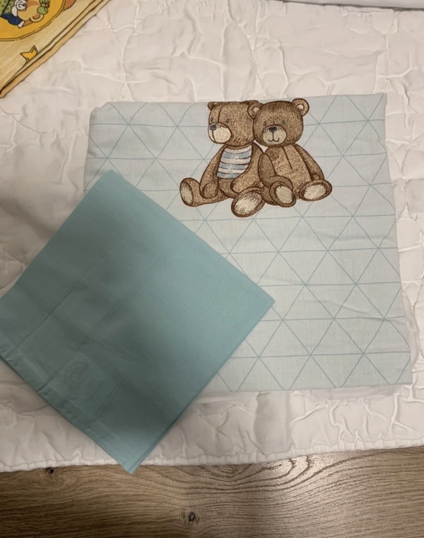 K paplónu rada pribalím pasujúce obliečky (3x na paplón + 3x na vankúš (avšak vankúš nepredávam). Na bledomodrej vankúšovej obliečke je malý fliačik (aj na foto), ktorý som neskúšala vyprať. Inak sú obliečky v top stave, ako nové, biela je naozaj biela, nemajú fľaky ani iné poškodenia. Rozmer vankúšových obliečok je 36x32cm. Predávam len spolu.