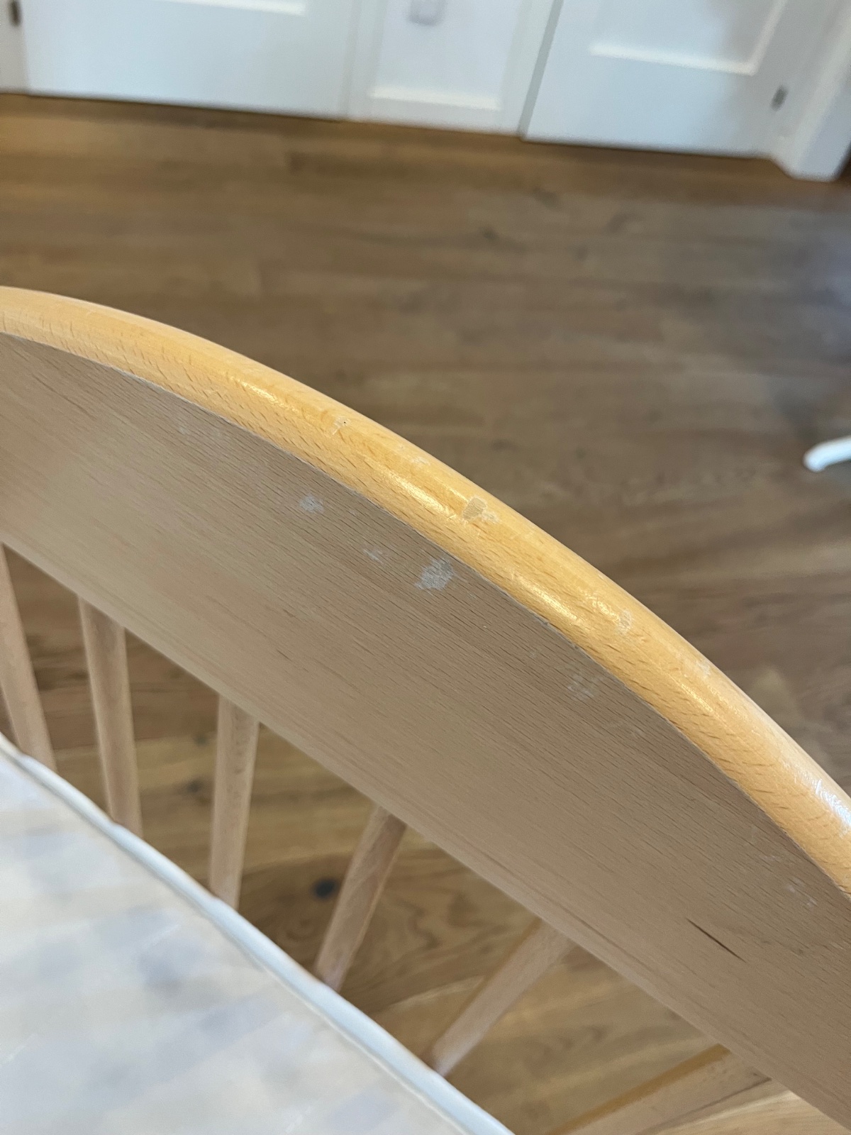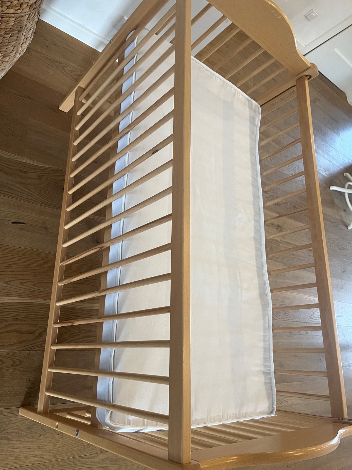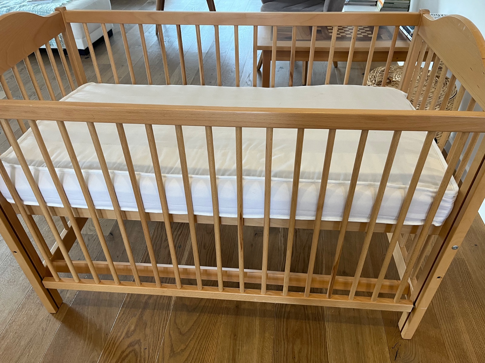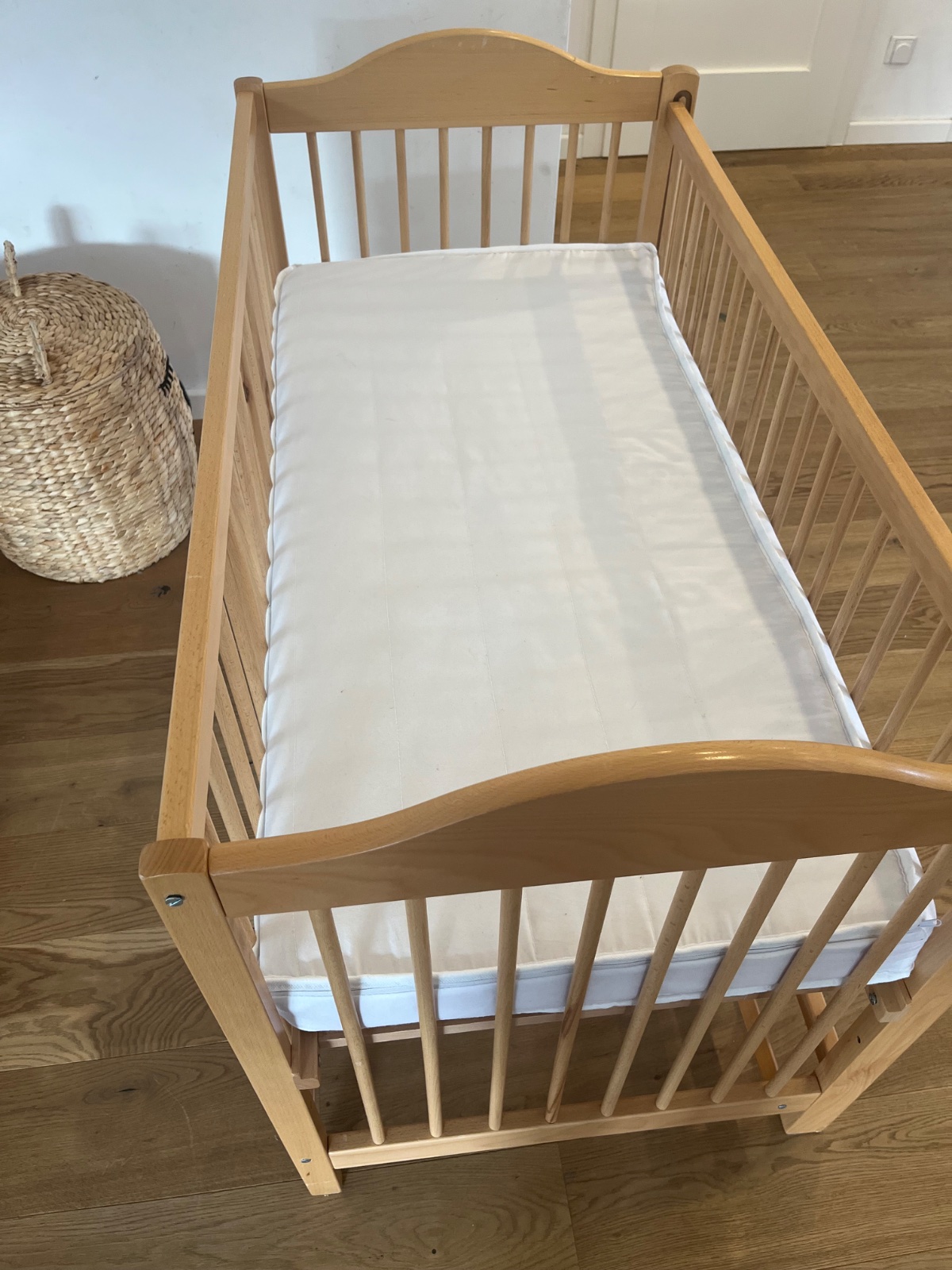 Drevená postieľka z bukového masívu s matracom, na jednej strane drobné ošúchané miesta-viď foto.