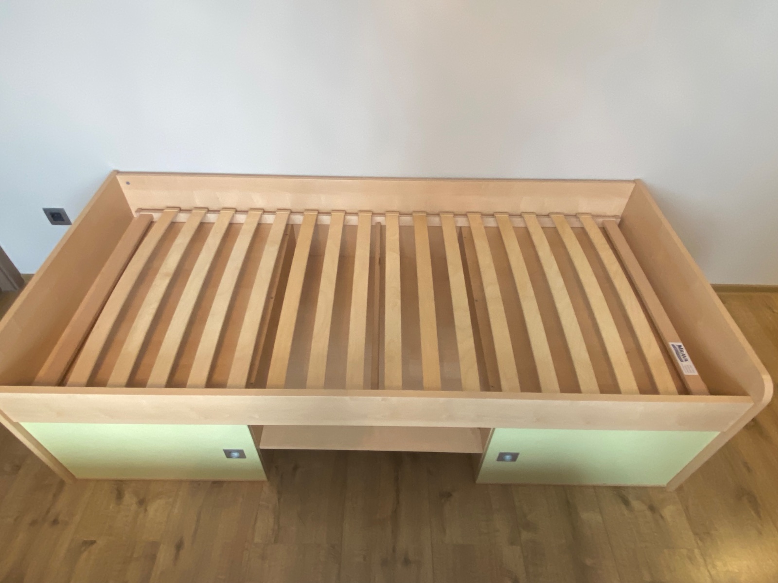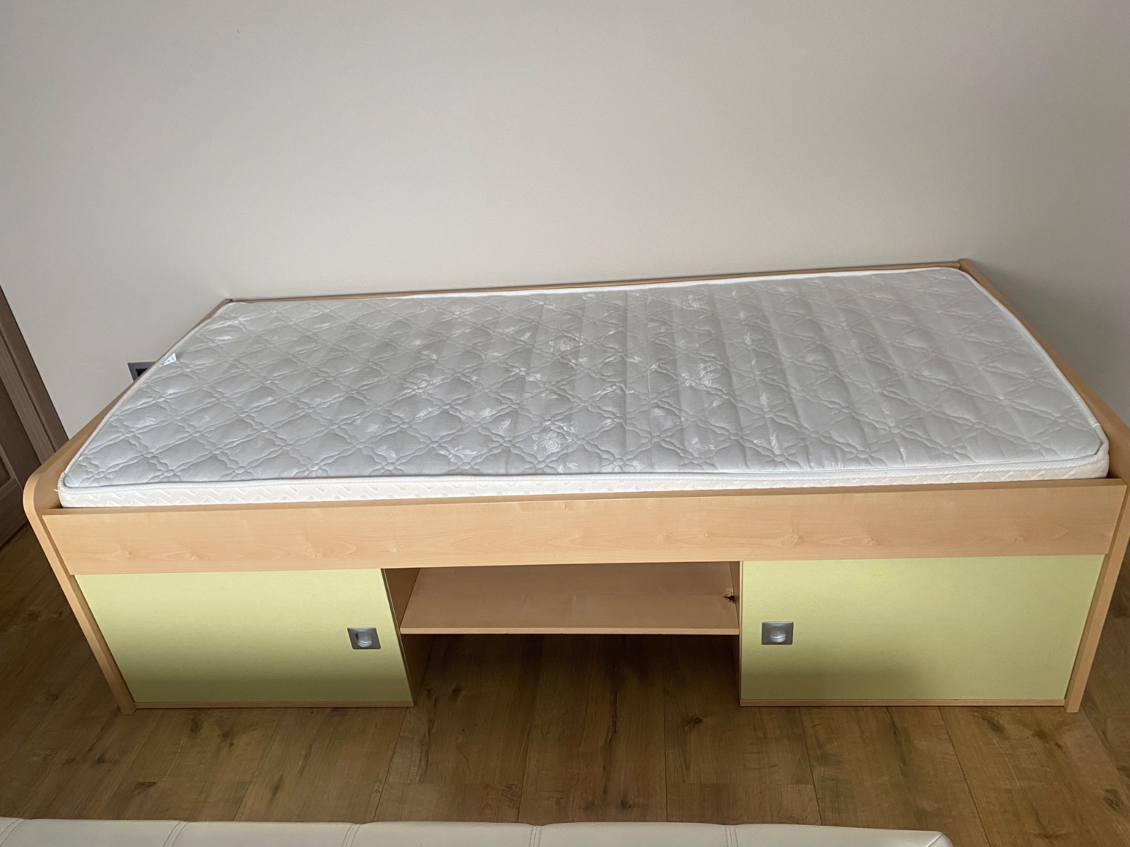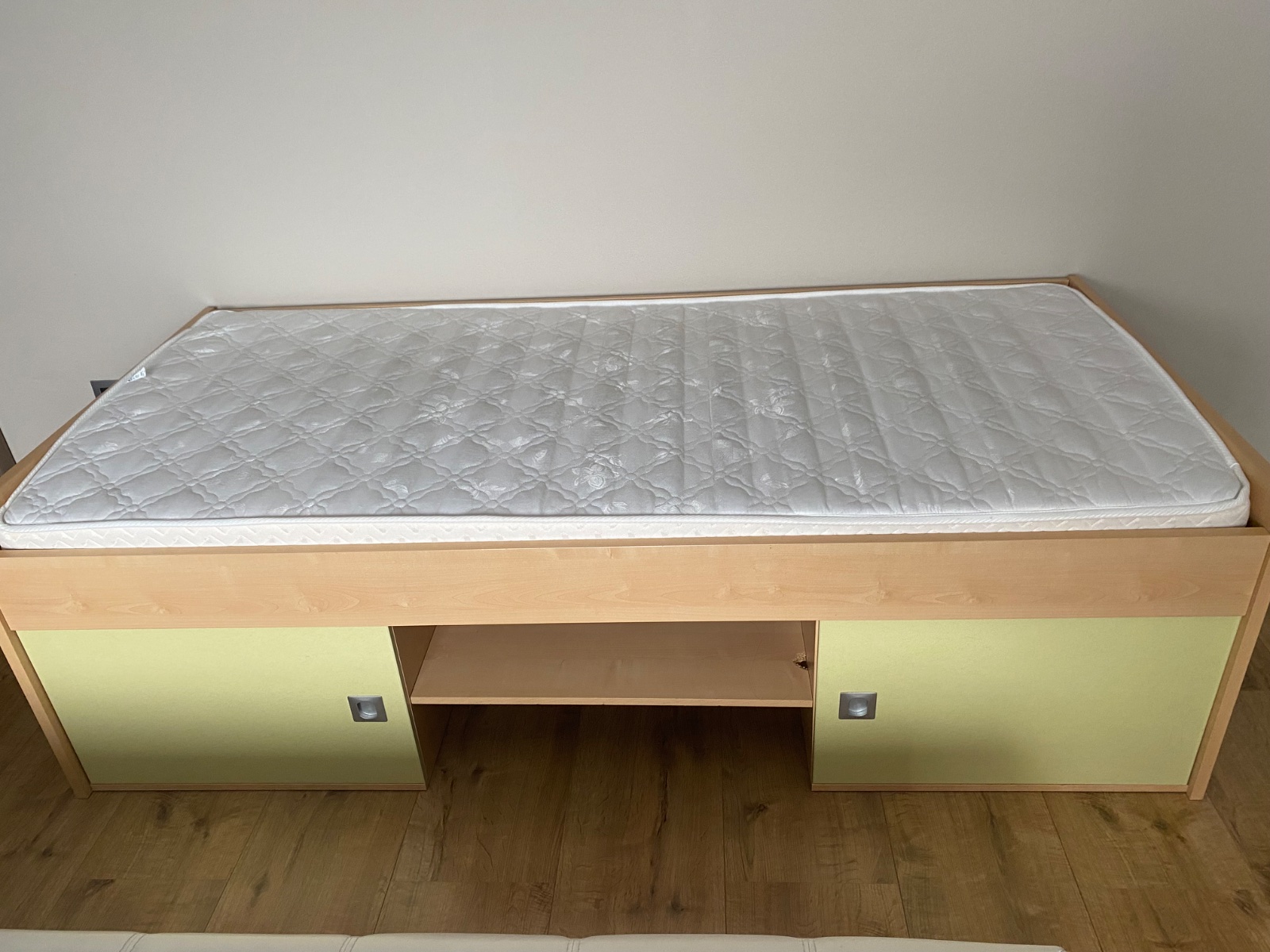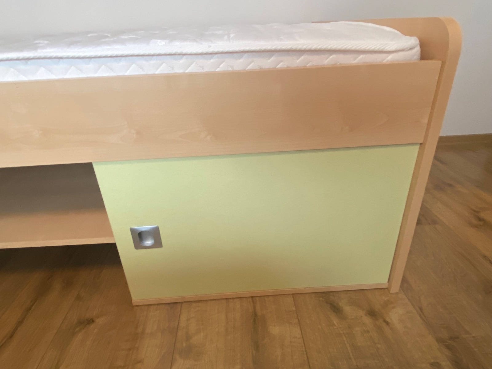 Posteľ s kvalitným roštom a matracom značky Materasso, s úložným priestorom pod posteľou-vid´ foto. Trocha poškodena drevotrieska vo vnútornej časti ale nie viditeľné, v dobrom stave.