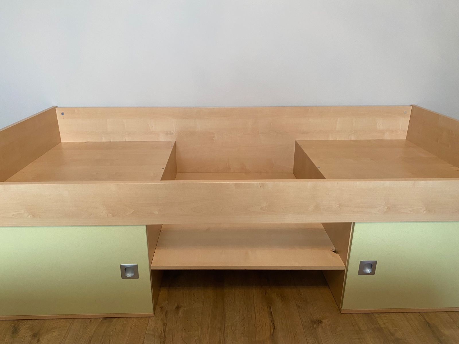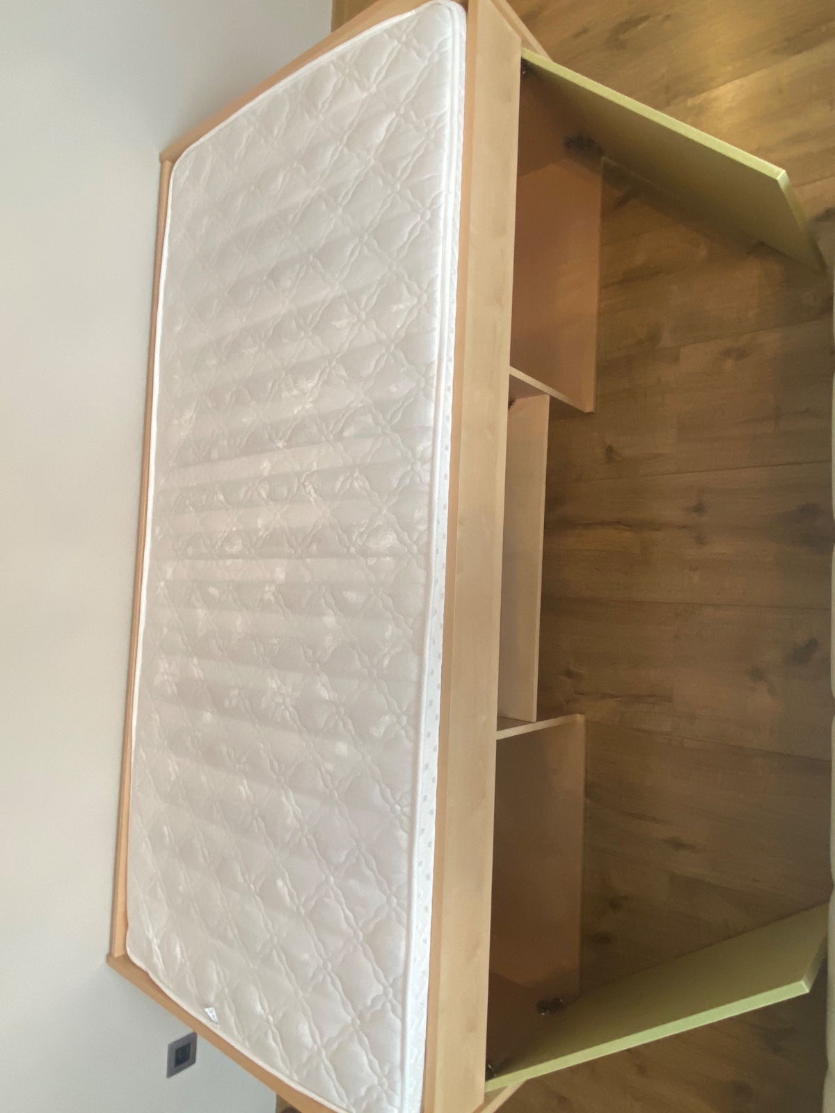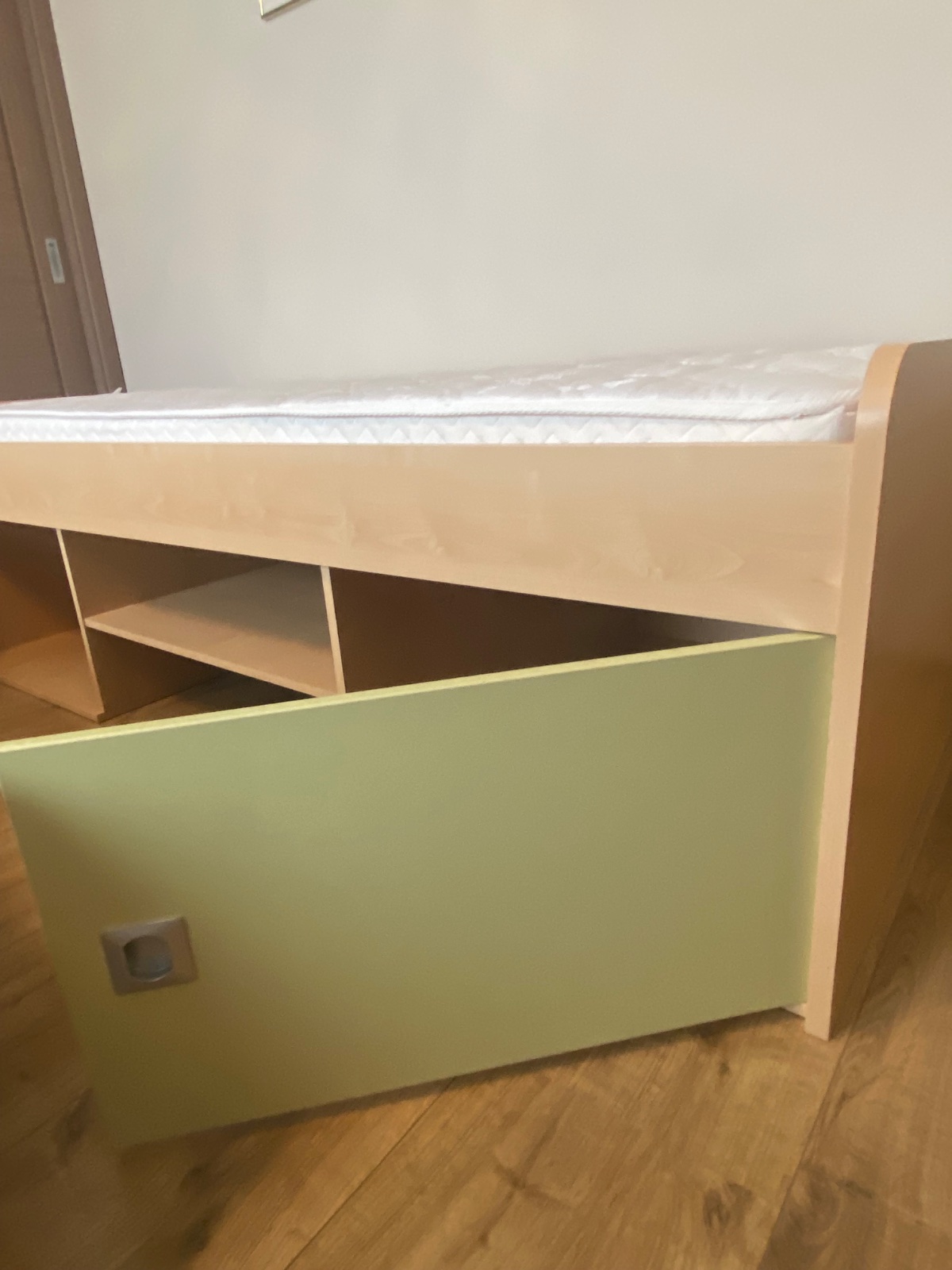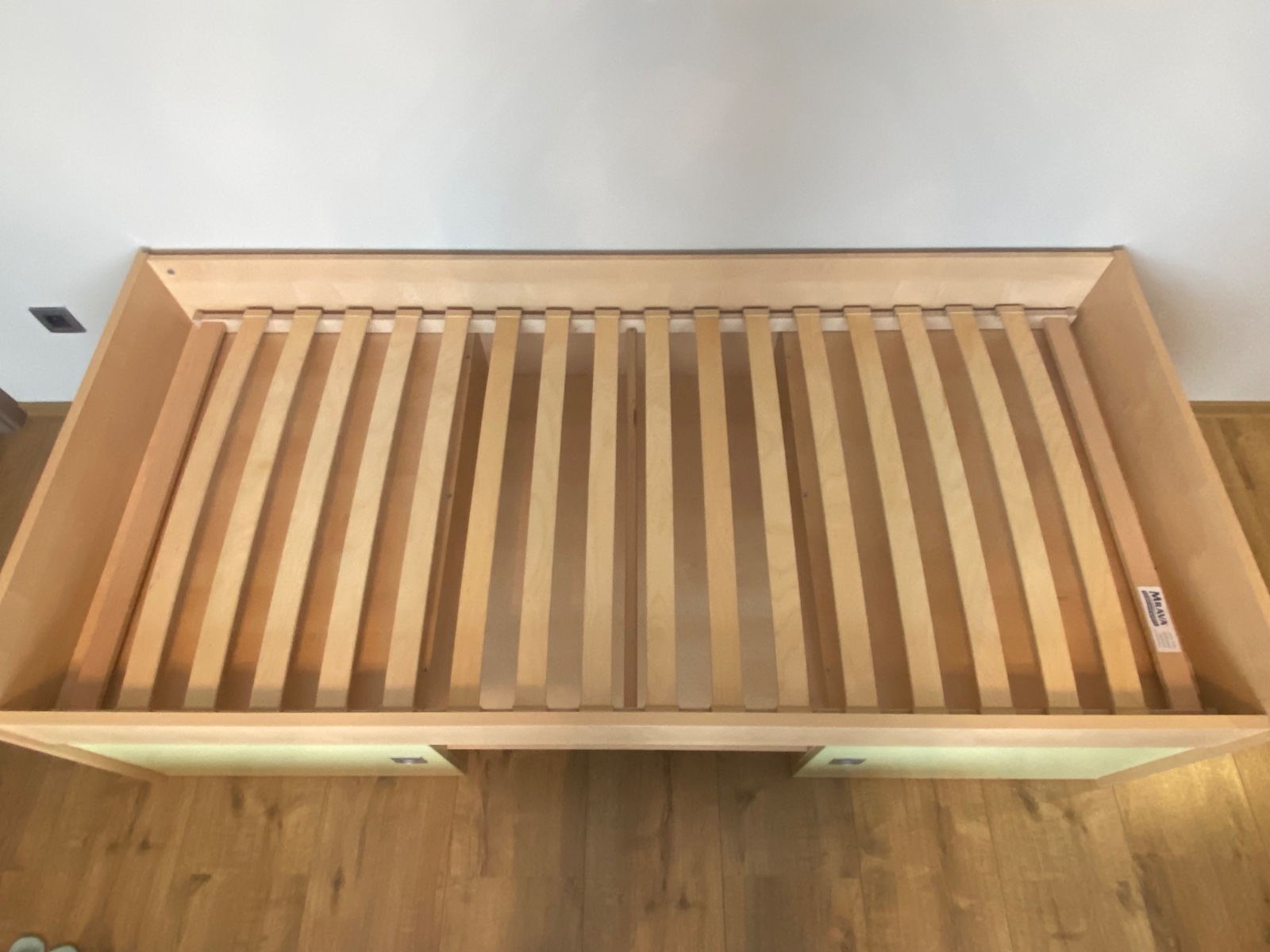 Posteľ s kvalitným roštom a matracom značky Materasso, s úložným priestorom pod posteľou-vid´ foto. Trocha poškodena drevotrieska vo vnútornej časti ale nie viditeľné, v dobrom stave.