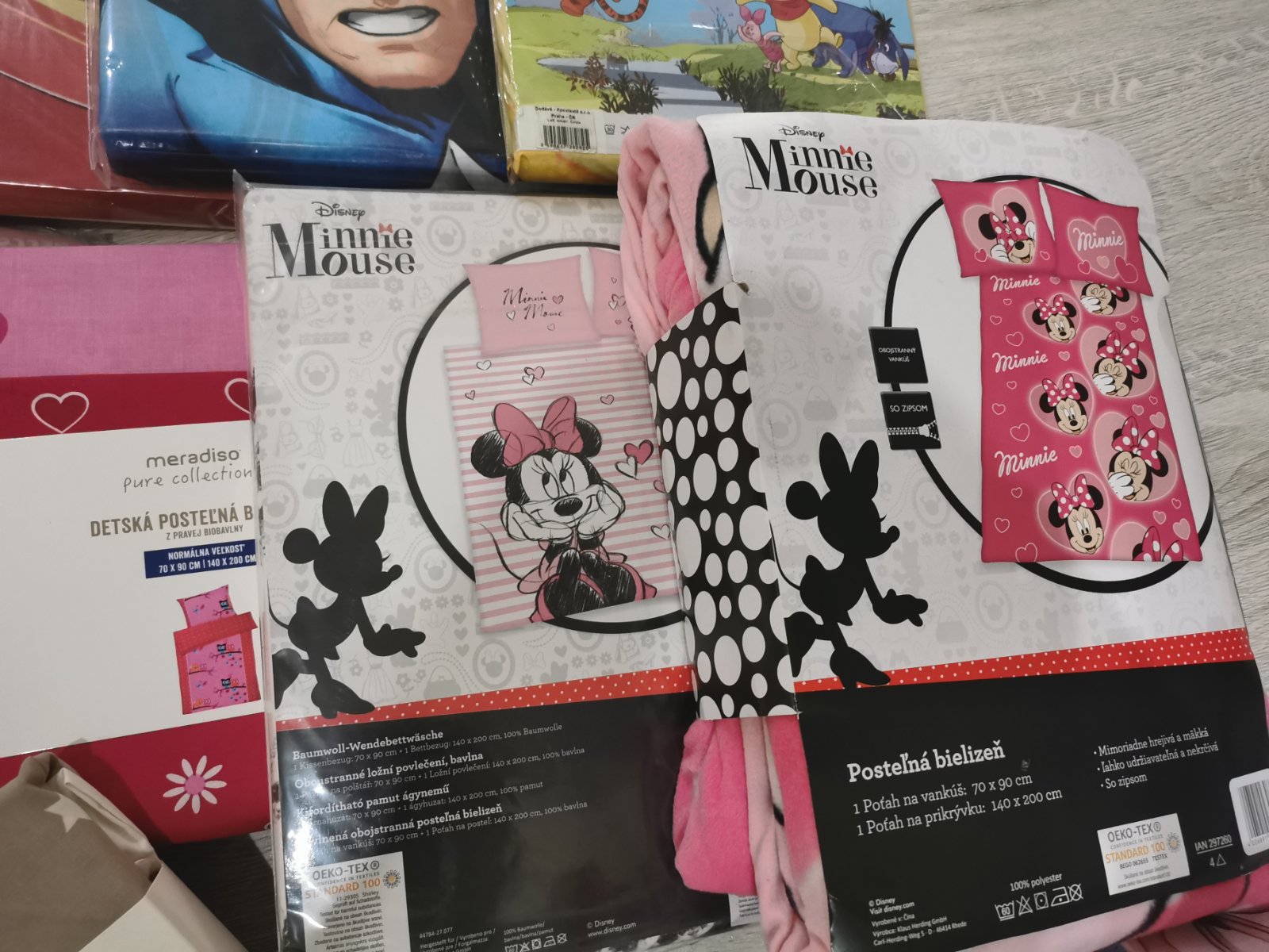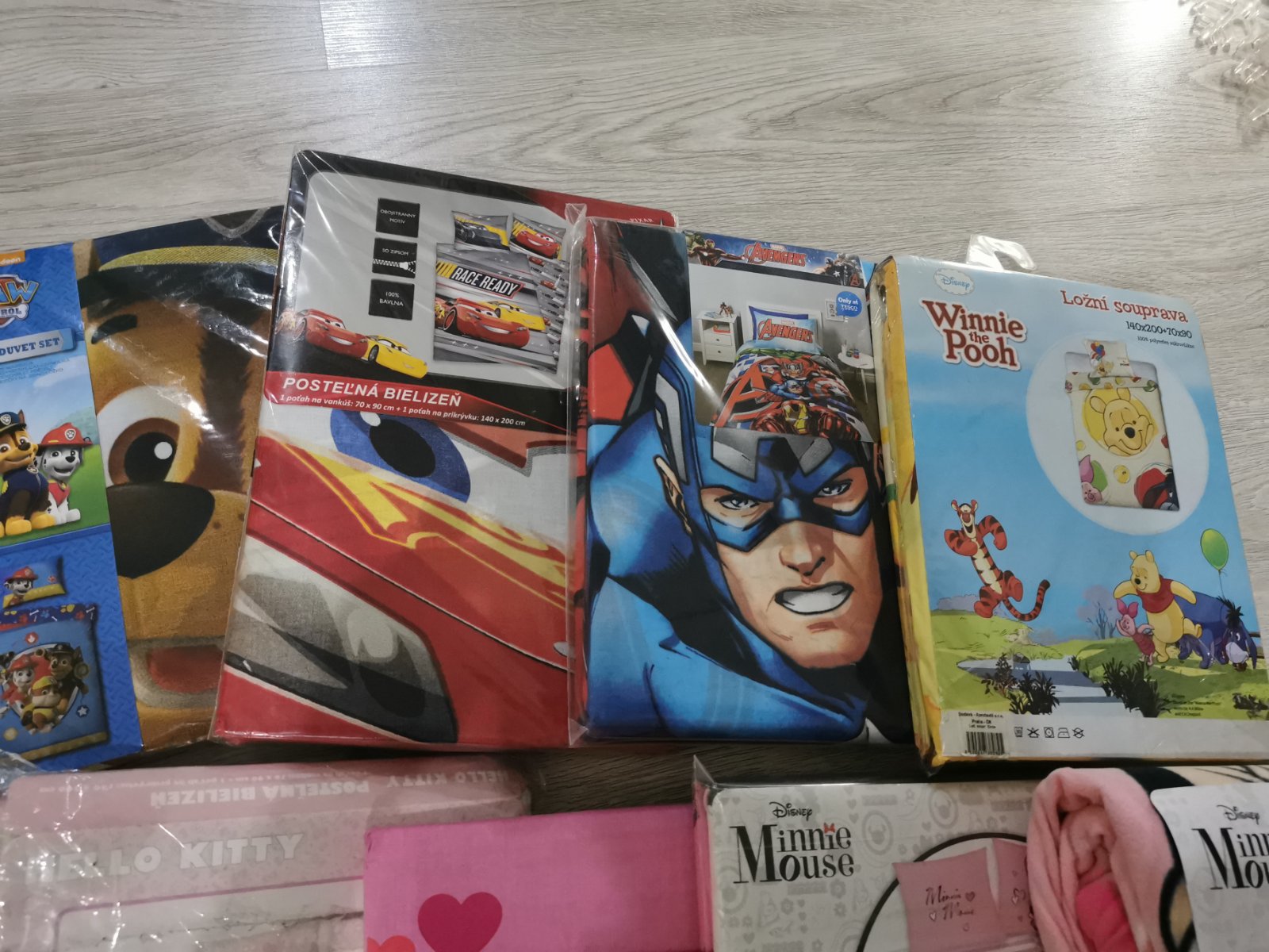 Predám rôzne obliečky s rôznymi motívmi, Minie, Avengers, Paw Patrol, Cars a iné, viď foto. Všetky majú rozmer 140x200cm, akurát Minie s Mickey je 40x60/ 90x135cm. Sada Lupilu hviezdičková obsahuje aj napínaciu plachtu 60-70x120-140x14cm a paplón je 130x90 + vankúš 40x60cm - 13€. Cena uvedená za ks, všetky sú nové, originál zabalené. Predám aj plachty - biela a ružová (100%bavlna) sú v balení 2ks, cena za balenie 9€, biela tesco plachta(75%bavlna a 25% polyester) 4,50 a ružová Nika je (100% bavlna) tiež 4,50. Všetky majú rozmer 70x140cm.Hello Kitty, Cars a Minie s pásikmi predané.V