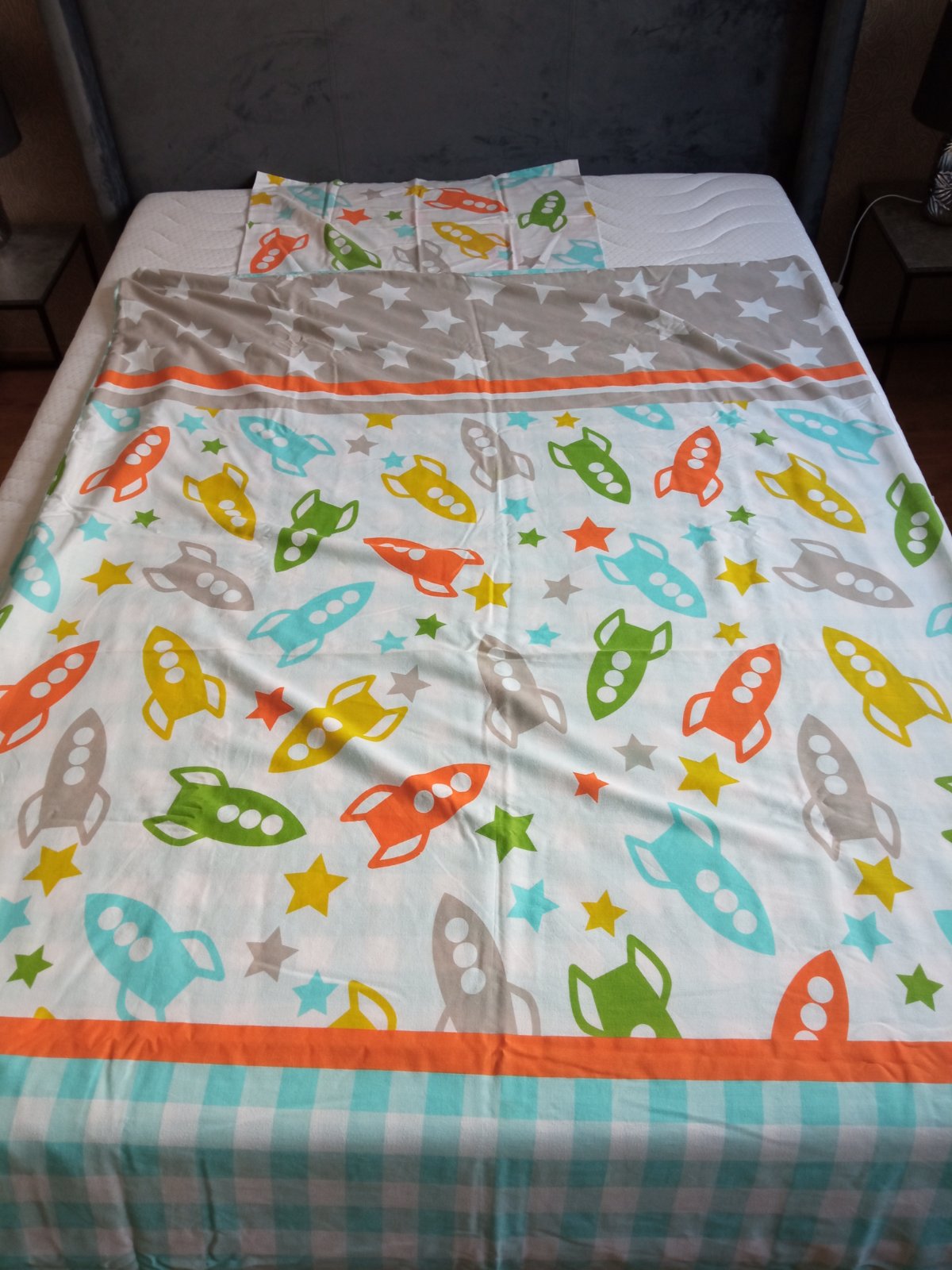 Obliečky s raketami. Kupované v Írsku, dlhodobo stáli, treba si ich oprať, malé fľaky sa určite nájdu.
