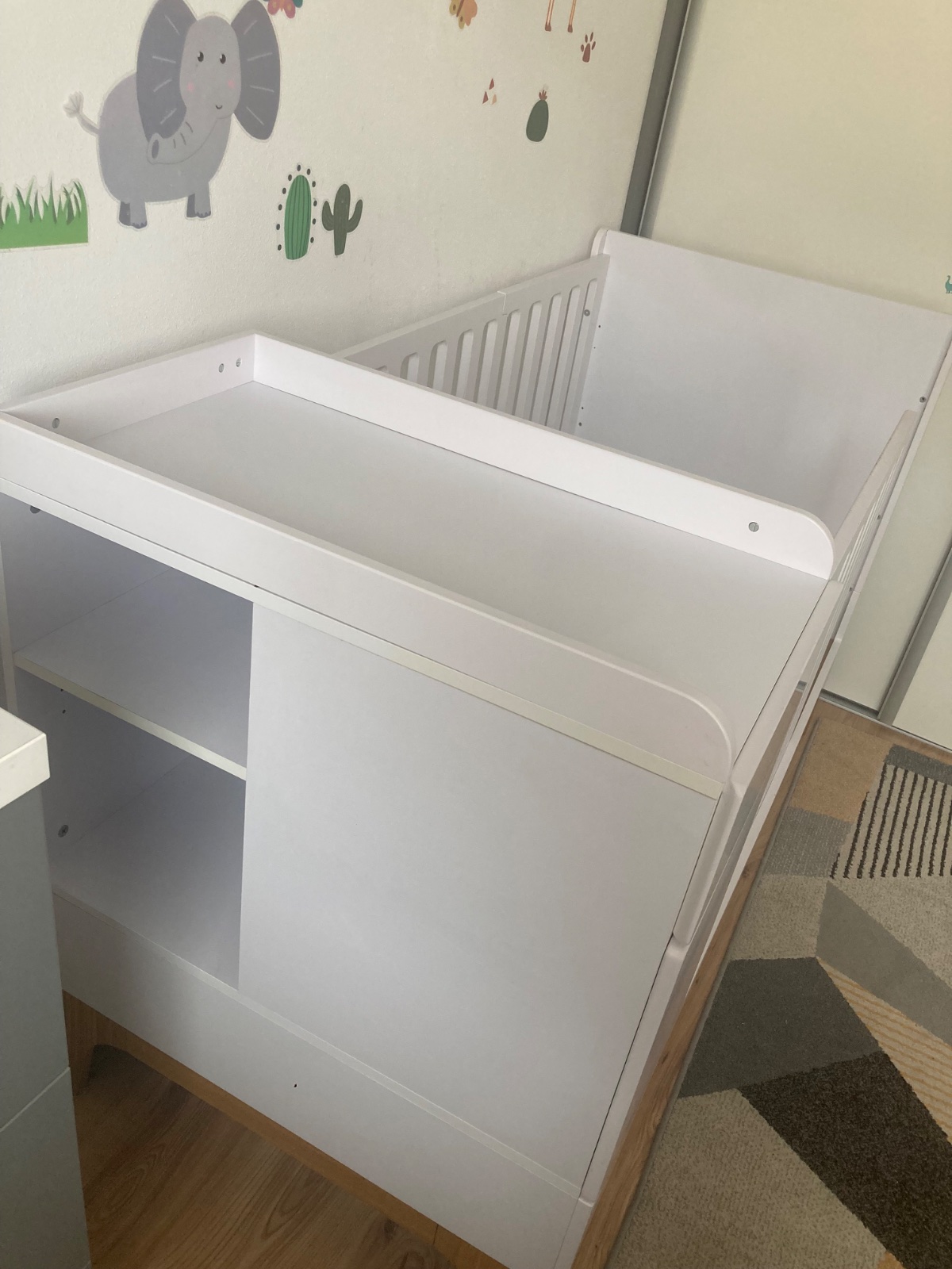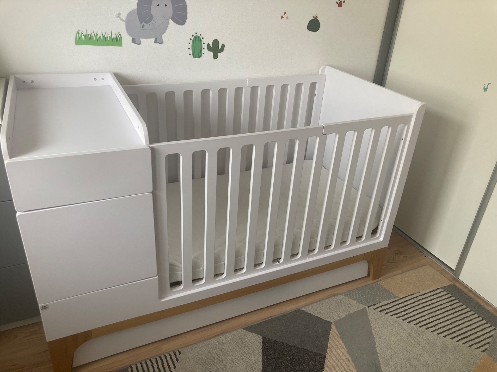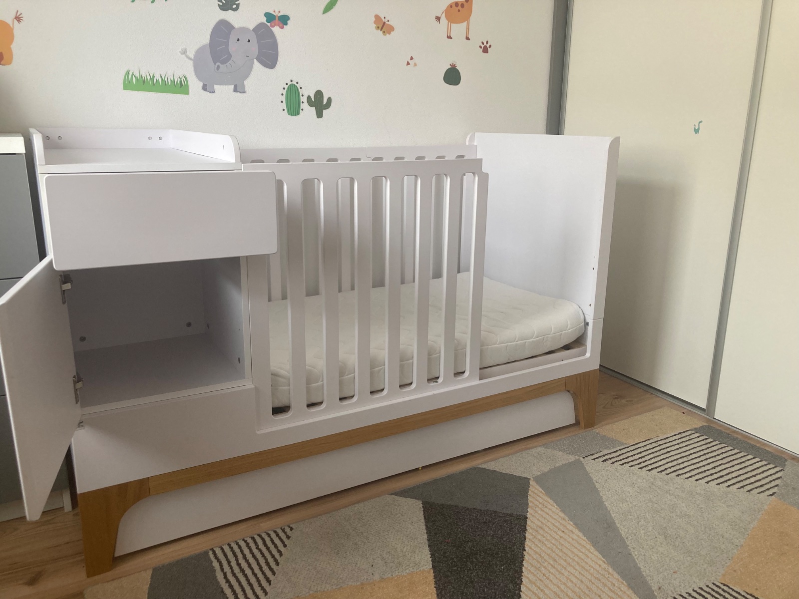 Predáme multifunkčnú detskú postieľku UP! so zásuvkou, skrinkou, policami a prebaľovacím pultom. Kupovaná za 550 € (aktuálna cena 611 €). Postieľka bola používaná po dvoch deťoch, má bežné známky používania (drobné škrabance a oderky), preto ju predávame za zvýhodnenú cenu 250 €.