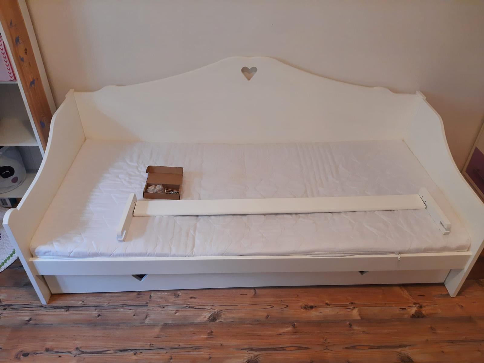 Krásny stav, používaná občasne 3 roky Rozmery postieľky: Dĺžka: 165 cm Šírka: 85 cm Hrúbka dosky: 22 mm Výška vpredu: 51 cm Výška vzadu: 69 cm Maximálna záťaž: 190 kg Rozmery matraca do postieľky:...