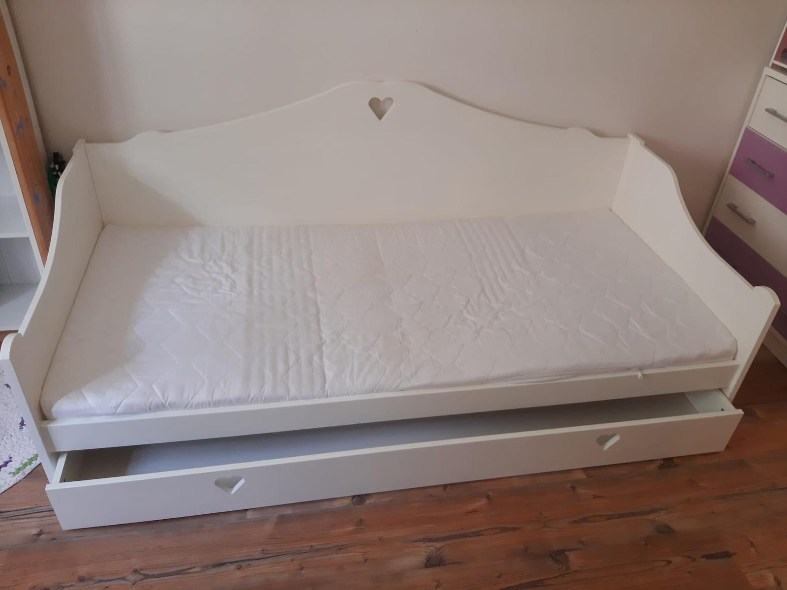 Postieľka po dcérke.Pre dievcatko ktore ma rado mačičky.Širka matracu 80cm dĺžka 165 cm.matrac ani raz pocikany. Zabrana do pol postielky. Úložný priestor. Na otázky rada odpoviem ..