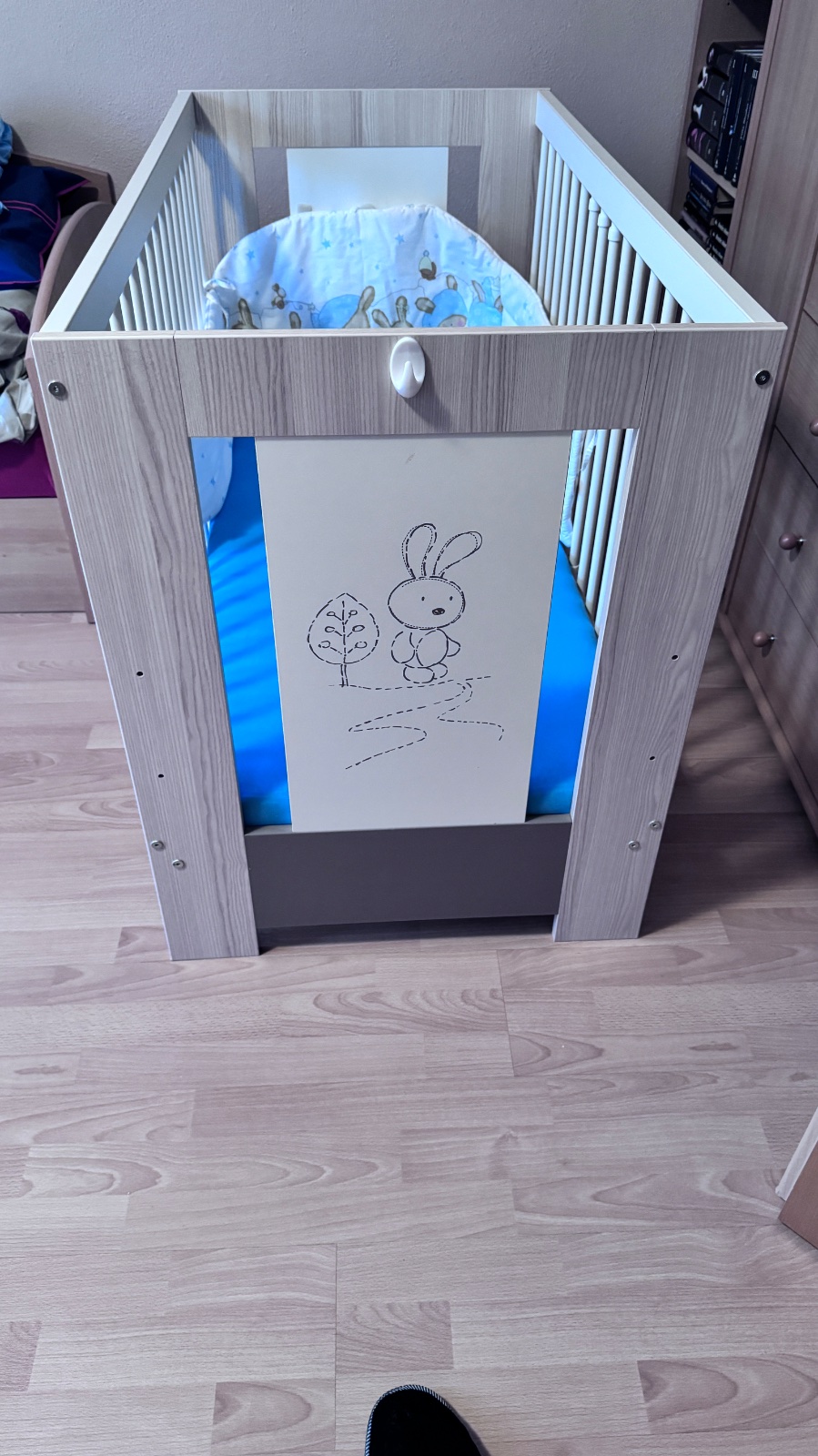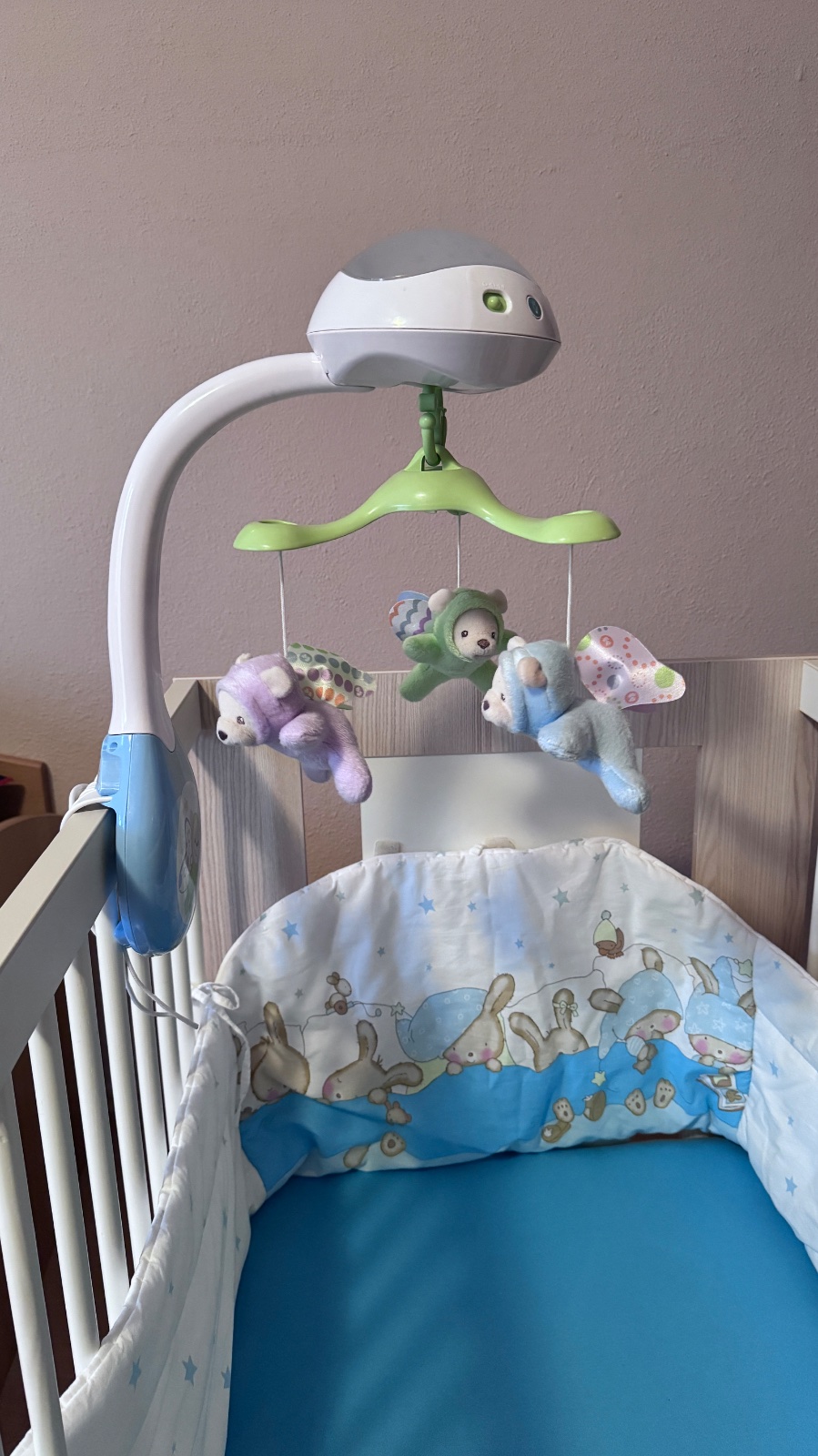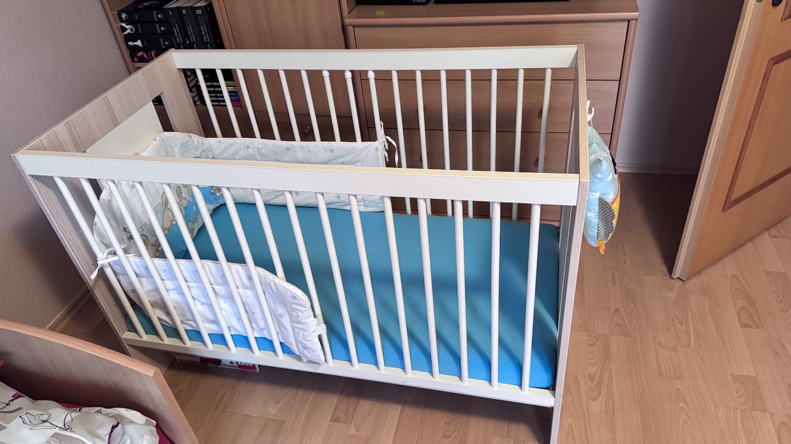 Vyborny stav - postielka bola pouzivana len u starych rodicov. Matrac mozne nastavit v troch polohach. Cena aj s matracom a mantinelom.