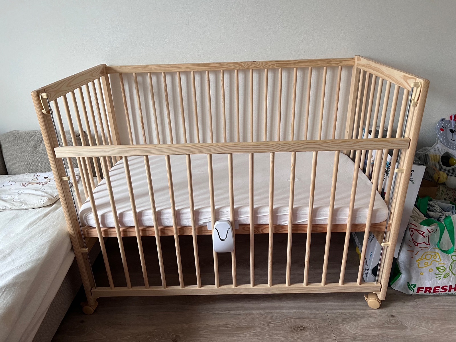 Predám postieľku z borovicového masívu s monitorom dychu Babysense 1 Pro. Súčasťou postieľky je aj matrac, chránič matraca a 3 plachty (1x froté, 2x bavlna).