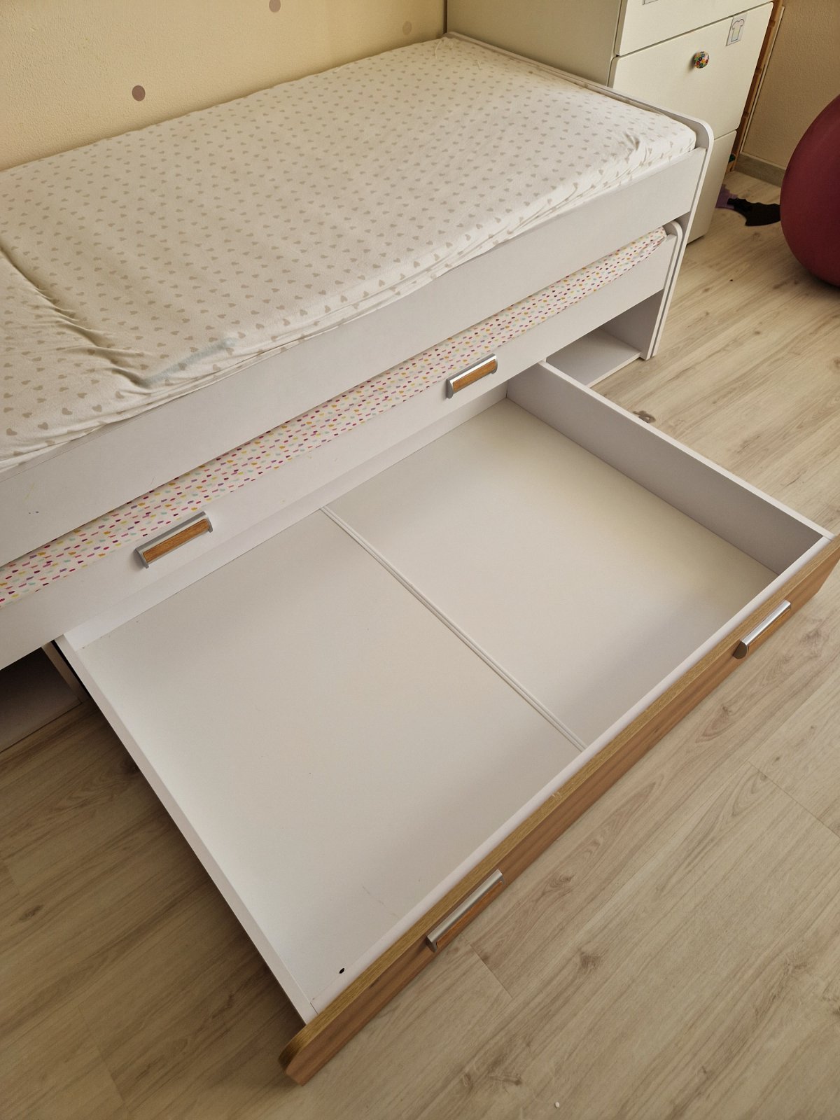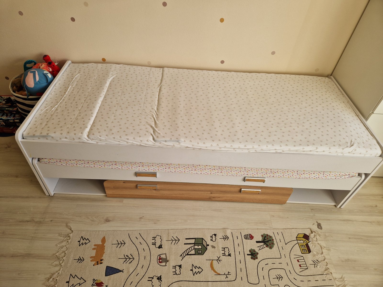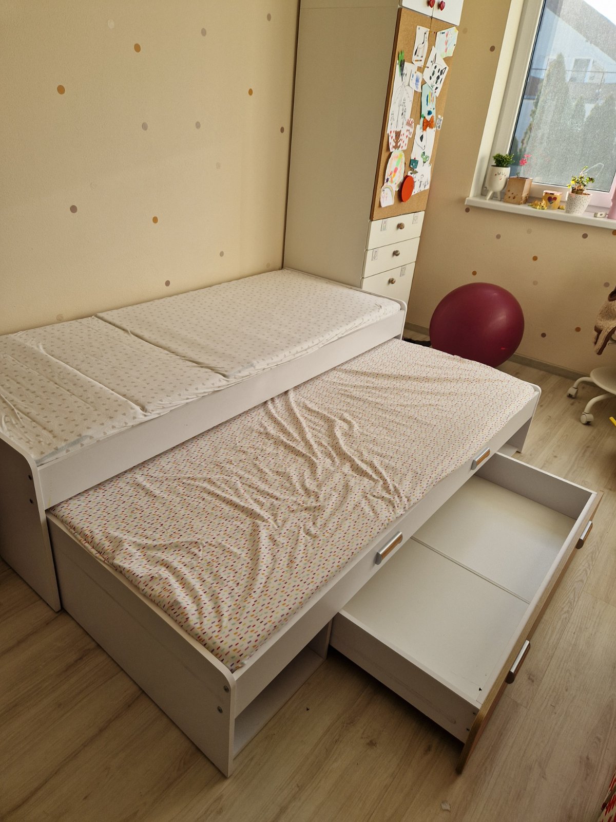 Top stav.Bez poškodení ( máme ju cca 2 roky )...výsuvná posteľ je široká cca80cm dĺžka cca 200.Predaj s madracmi ale bez roštov. (ma štandardnú šírku a dĺžku tak sa dajú dokúpiť nové). Vo vnútri postele je úložný priestor a tiež po bokoch viz.foto. Len osobný odber.