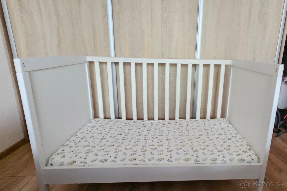 Predam detsku postieľku SUNDVIK s nepoužívaným matracom KRUMMELUR a krásnou plachtou v prírodnom štýle.Postielka bola používaná pri synovi sporadicky(skor ako odhradka na chvilu,vidno otlacky od zubov na vrchu postielky) nechávali sme postielku pre dcéru,preto aj nový matrac,ale nakoniec spi od narodenia so mnou.Takze je u nas nevyužitá. Bocna strana,ktorú nevidno na fotke je súčasťou postielky,ale už je zložená.Cena dokopy 80 eur aj s matracom a prirodnou plachtou.Je mozne sa dohodnut iba na kupe postielky bez matraca a plachty-70 eur.Dakujem.Len osobný odber vo Zvolene.