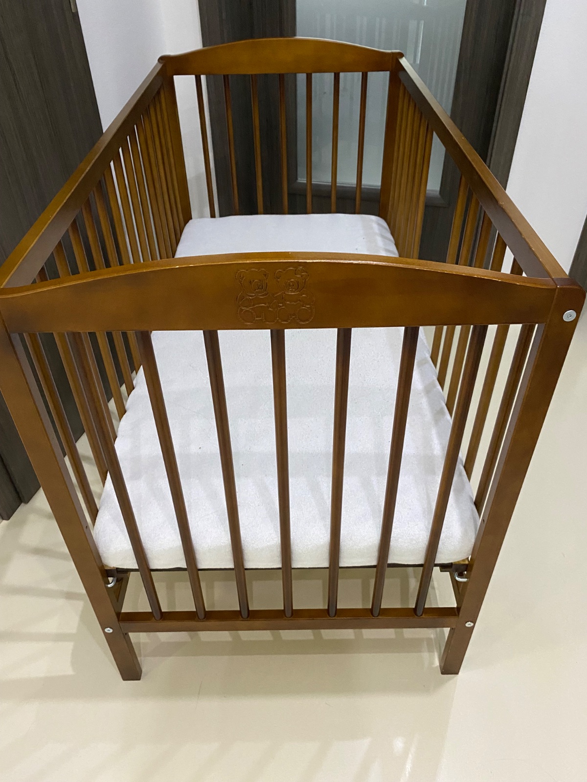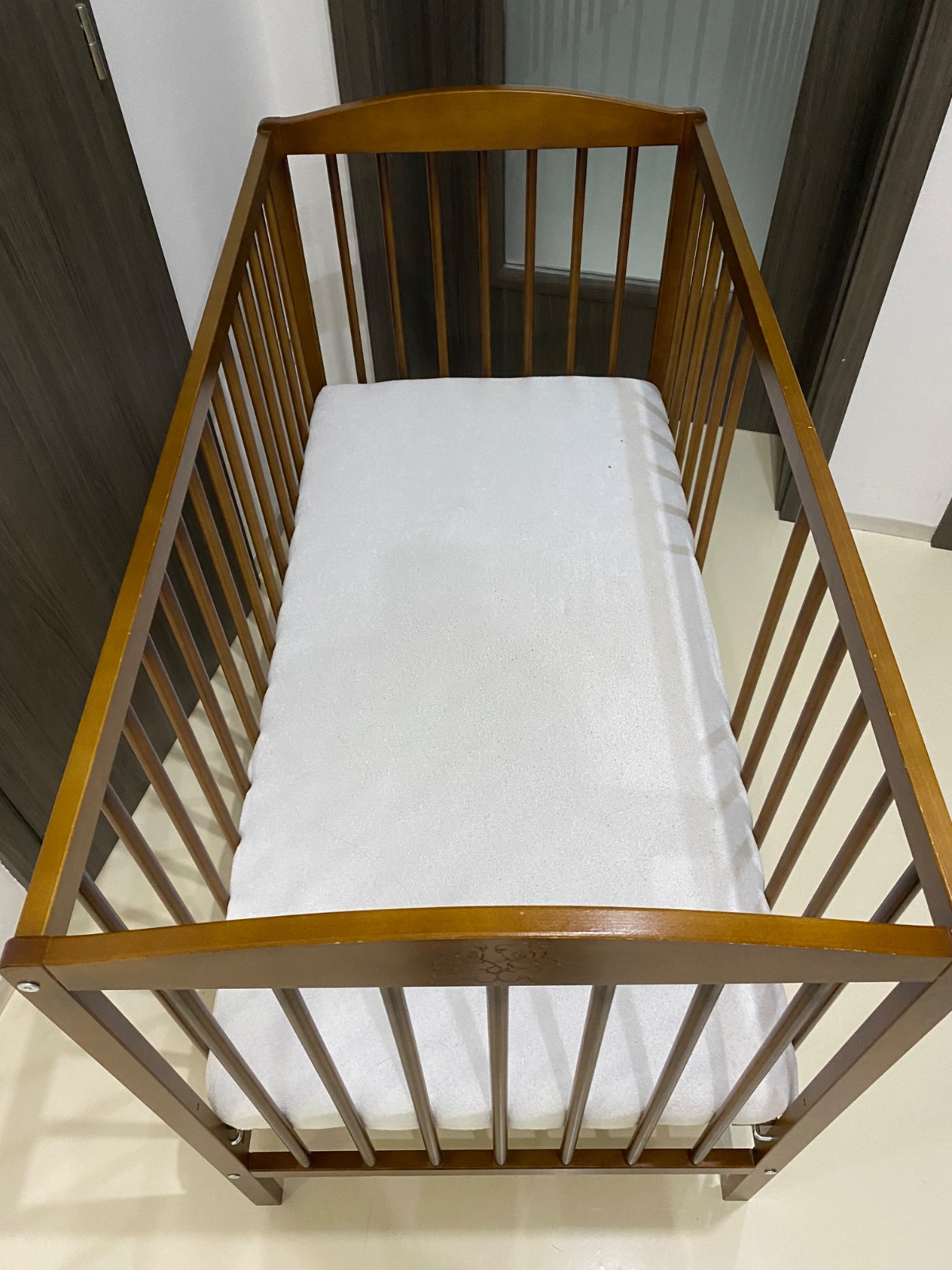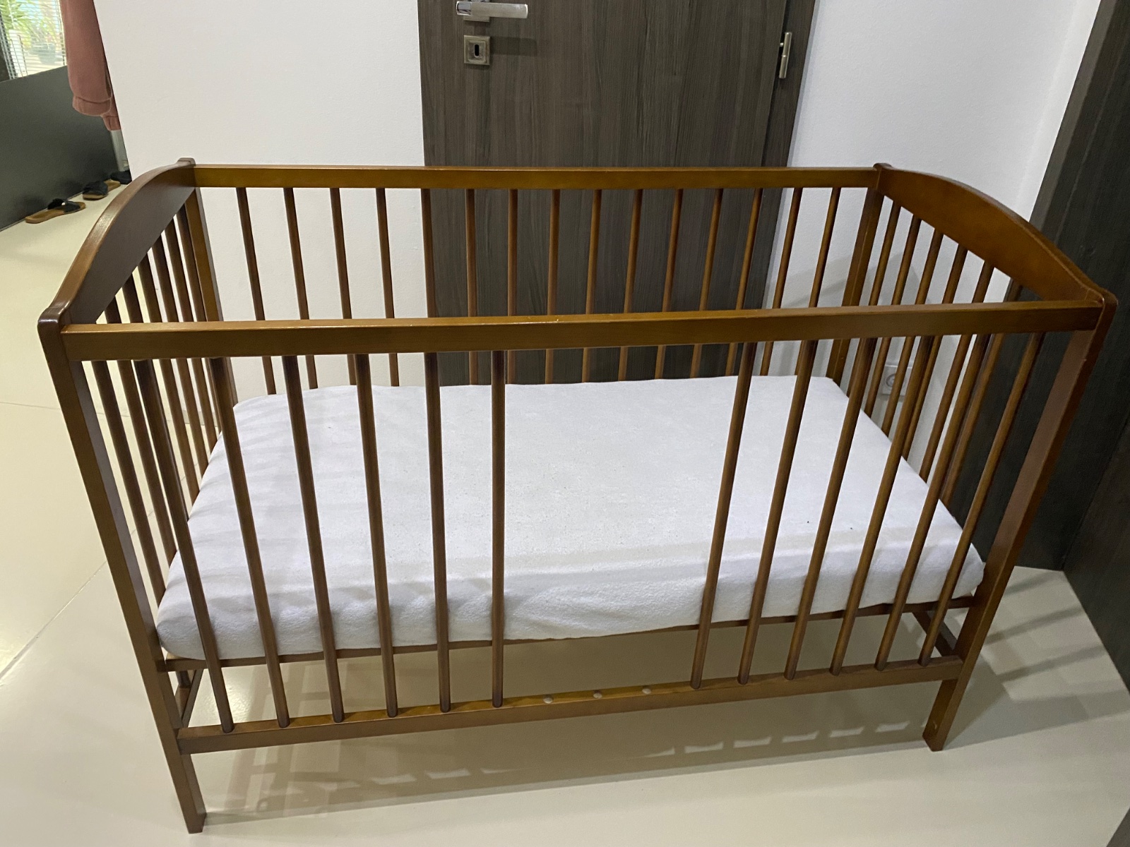 Predám detskú postieľku tmavo hnedej farby , kde sa dajú odňať 3 tyčky na prechod dieťatka von .