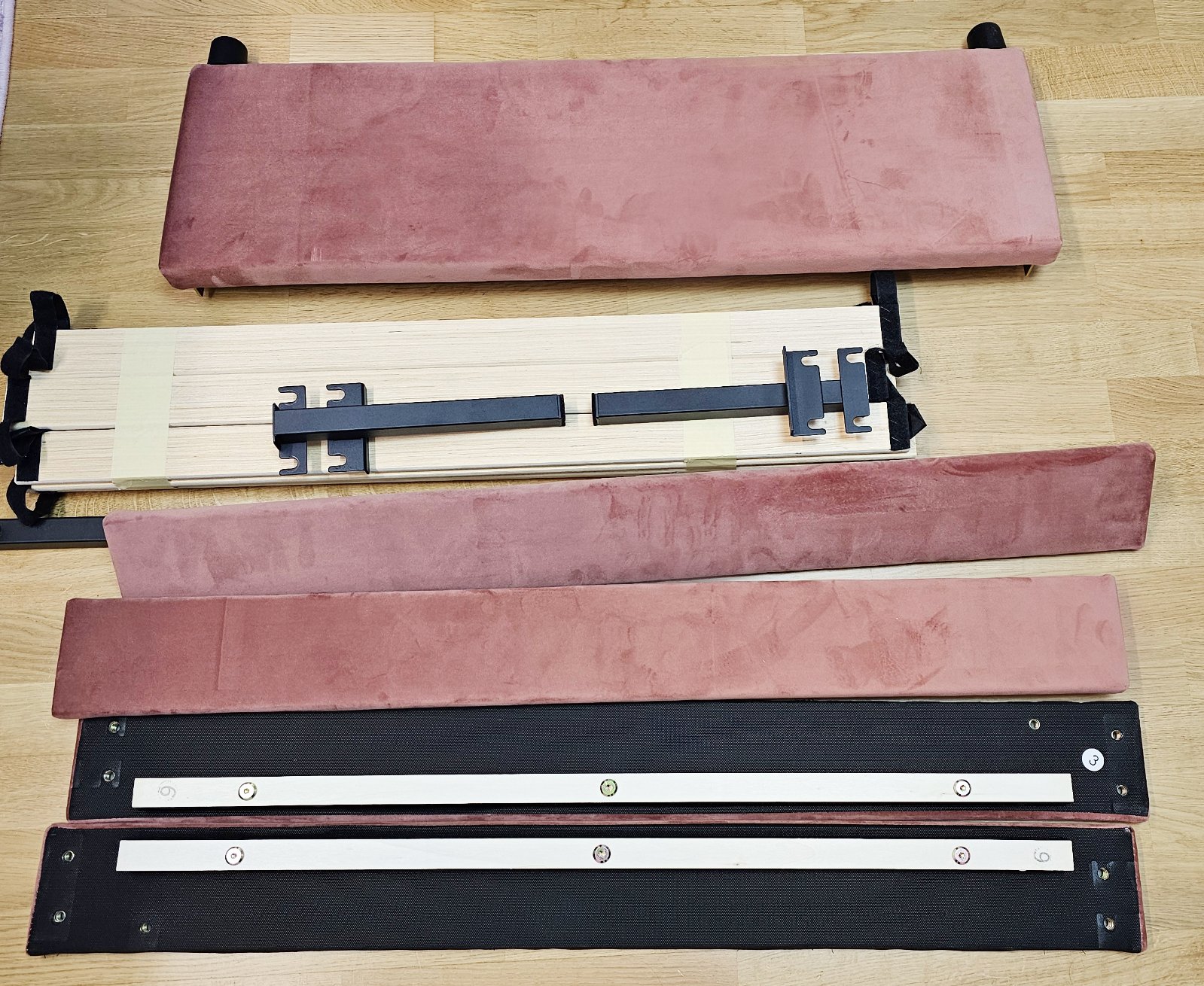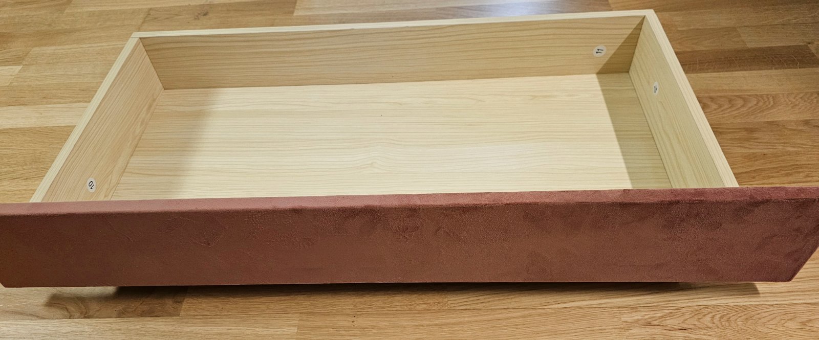 Nová, len šuflíky už zložené. Nesadla nám v miestnosti. Čalúnená posteľ je vybavená 2 zásuvkami.