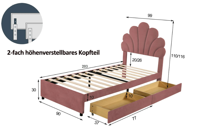 Vzhľadom na výškové rozdiely a hrúbku matraca je čelo postele výškovo nastaviteľné, pričom výšku možno meniť približne o 6 cm.