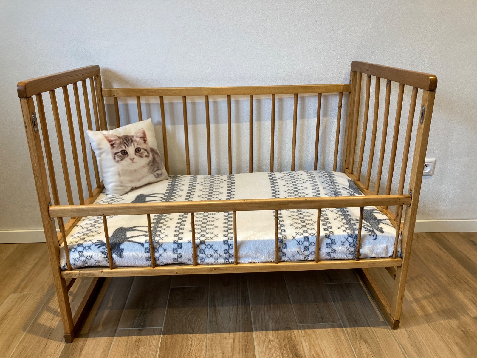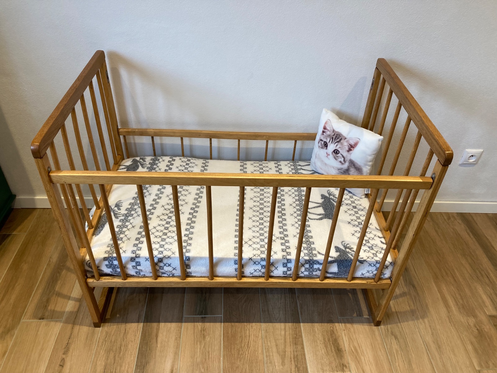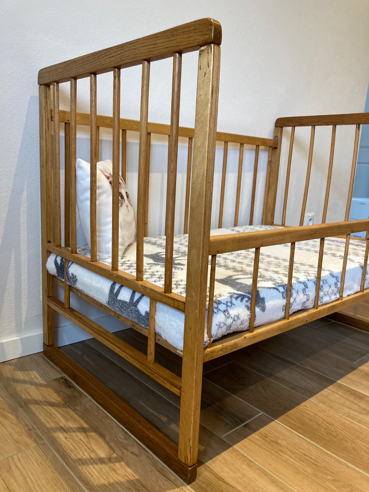 Retro detská postielka do malých priestorov. Má dĺžku 108cm a šírku 67cm. Výškou 82 cm je ideálna k manželskej posteli. Jednoduchým otočením si môžete vybrať medzi nižšou a vyššou verziou. Je bez matraca a v rozloženom stave.