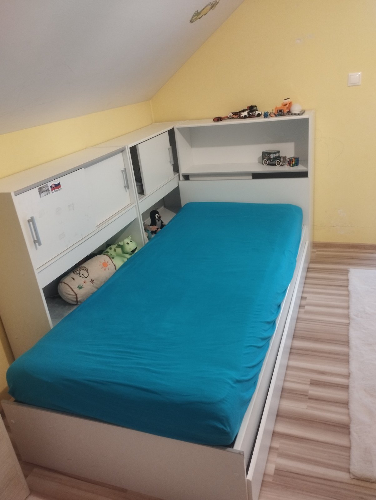 Používaná posteľ. Ponúkam aj a roštom. Na poličkách sú posuvné dvierka. Sú tam akurát ešte polepené nálepky, na spodu sú 2 šuflíky na odkladanie veci