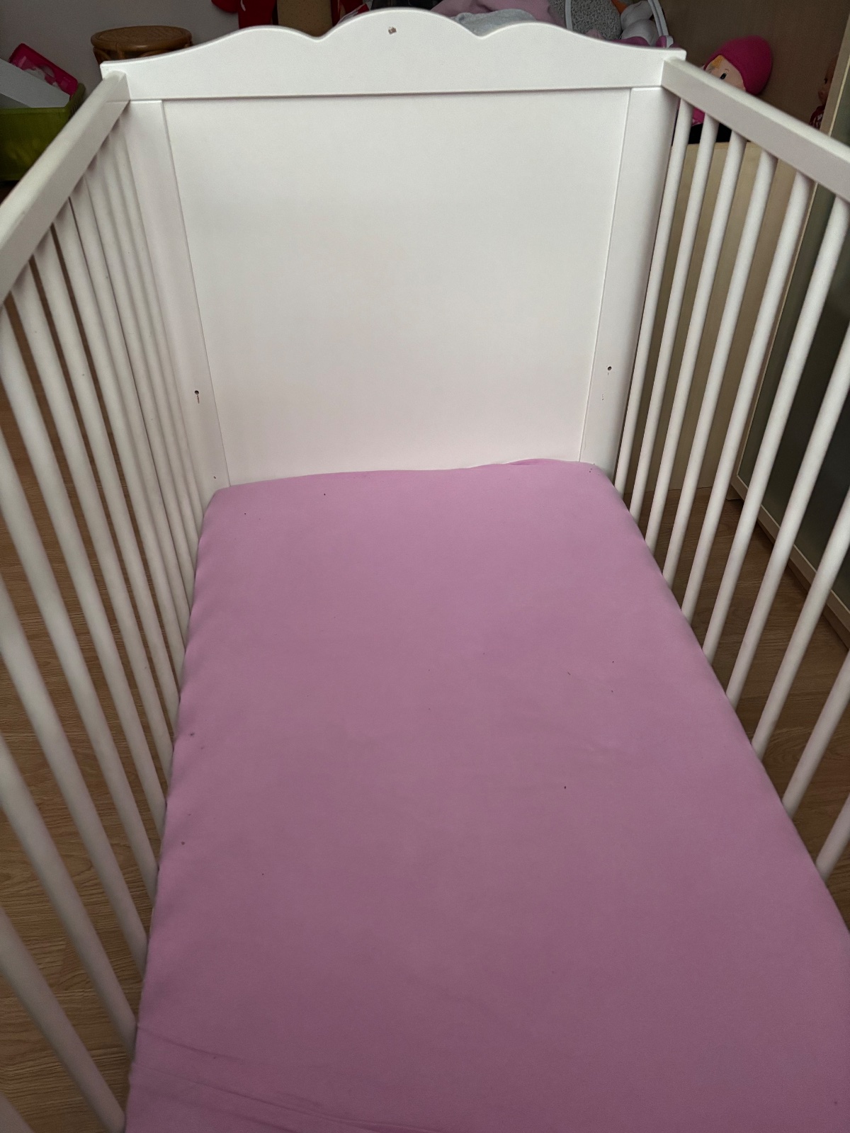 Predam minimalne pouzivanu postielku. Postielka je ako nova, velkosti 124×64cm. Detailny popis na fotkach. K postielke ide aj matrac 120×60cm a gratis 4x plachty ( 2x siva, 1x ruzova a 1x modra-nep...