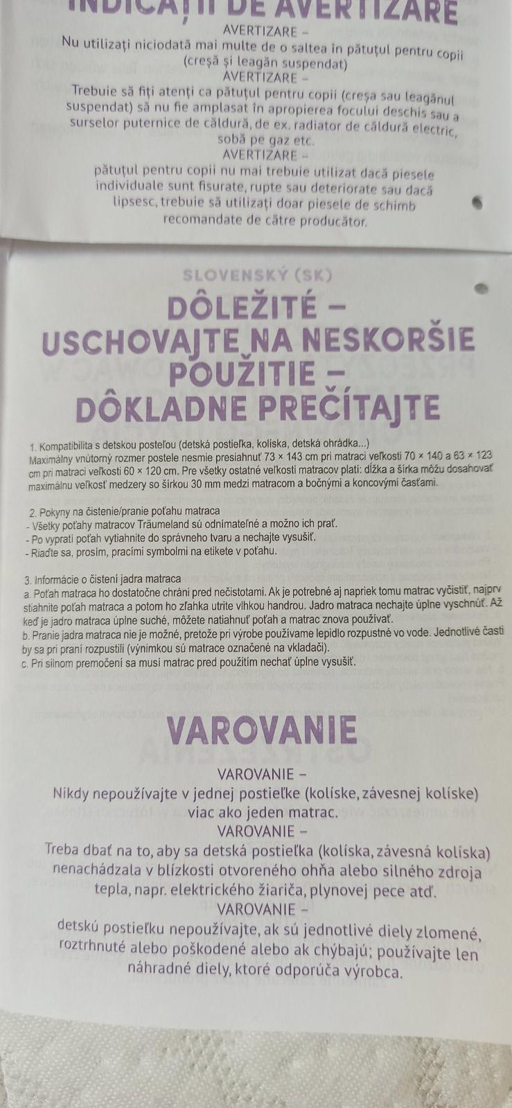 Veľmi pekný stav. Používaný iba dcérkou 1,5 roka. Matrac má stranu vhodnú na ležanie pre bábätká a pre stranu pre staršie deti. Na jednej strane sú dva menšie jemné žlté fliack v rohu, vznikli kvapnutim rybej mastičky na matrac. Rozmer matraca 69*120*10cm. Cena 30€ plus poštovné.