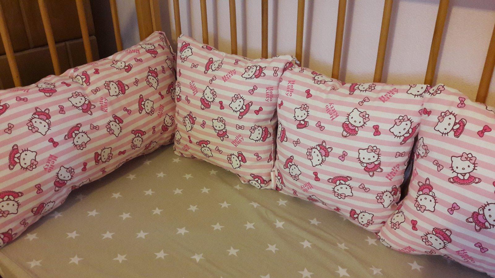 Mantinel zložený z vankusikov so snurkami, množstvo záleží na vás či chcete okolo celej postieľky alebo len polovicu . Na čele sú dlhé po stranach polovičné . Kus 6€ veľký 10€.