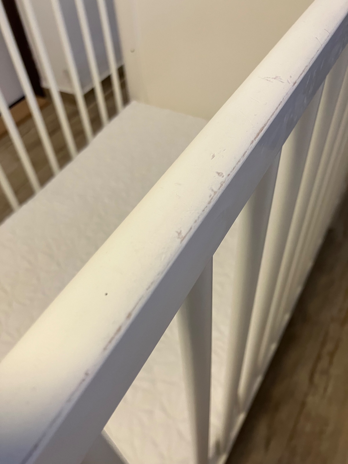 predám detskú postieľku s matracom, 2 palice sa dajú na jednej strane vybrať, bočné hrany su dohryzane