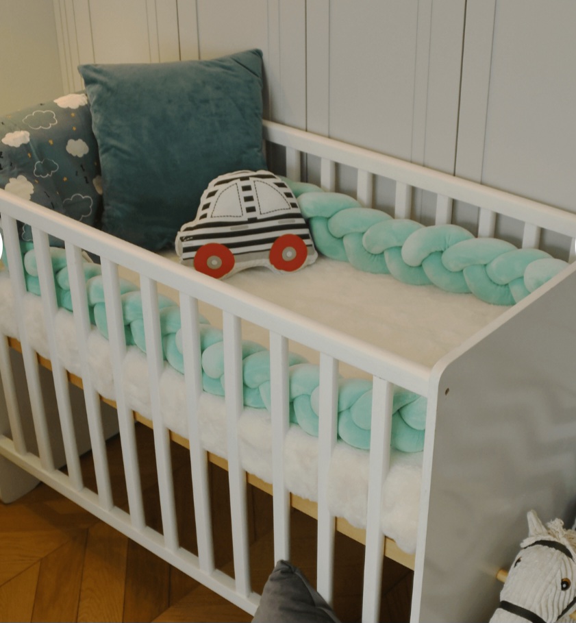 mantinel do postieľky v tvare pleteného vrkoča mentolovej farby je vhodným ochranným doplnkom do každej detskej izbičky. Zaručuje bezpečnosť vášho dieťatka počas spánku, chráni ho pred nárazmi, zároveň dokáže šikovne zútulniť interiér. Pre nepokojné a príliš aktívne detičky, ktoré v spánku zapletajú svoje malé rúčky do priečok postieľky, je skvelou ochrannou pomôckou pred boliestkami. Dá sa využiť viacerými spôsobmi. Vďaka svojej forme môže byť použitý ako ochrana pozdĺž konštrukcie detskej postieľky, ďalej ako oválne útulné hniezdo pre dieťatko, na ohraničenie priestoru na hranie, ako zábrana proti pádu do veľkej postele či izolácia od chladnej steny. Pletený mantinel MINKO s rozmermi 150x10x10 cm je vyrobený zo 100% polyesteru, vyplnený PP bavlnou, ktorá zabezpečí, že mantinel si zachová svoj tvar. Je náhradou za tradičný vankúšový mantinel. Tento krásny vrkoč určite poskytne vášmu dieťatku bezpečný a zdravý spánok. Navyše je vhodný aj ako darček pre nastávajúcu mamičku