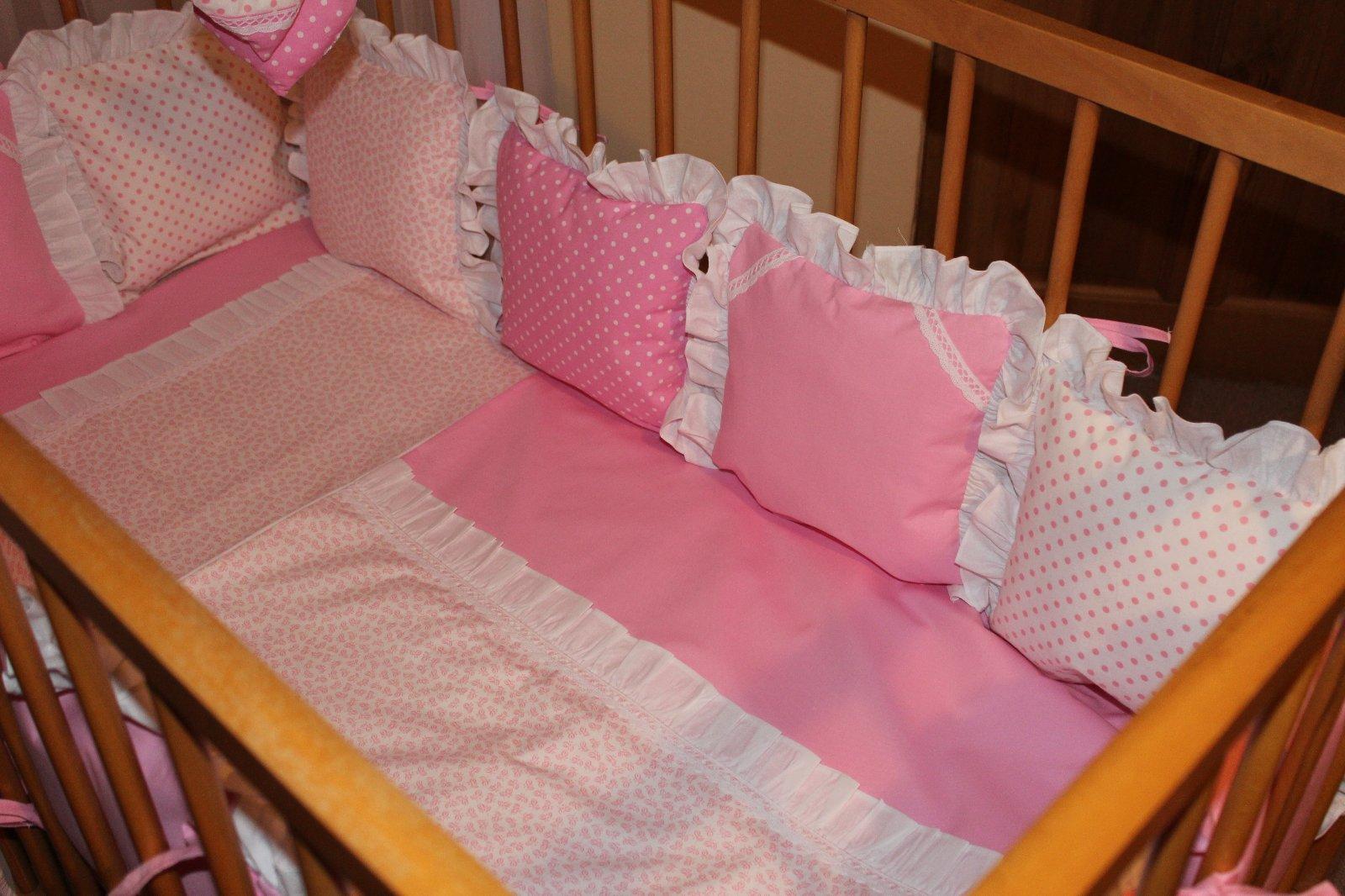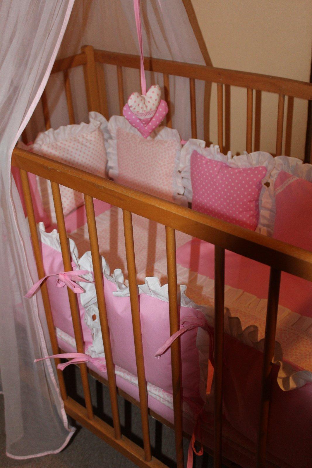 Súprava do detskej postieľky, 12 vankúšikov ako hniezdo, obliečka na vankúšik a perinku, ozdobná mašľa a srdiečka, plachtička, baldachýn na vyžiadanie navyše cena.
