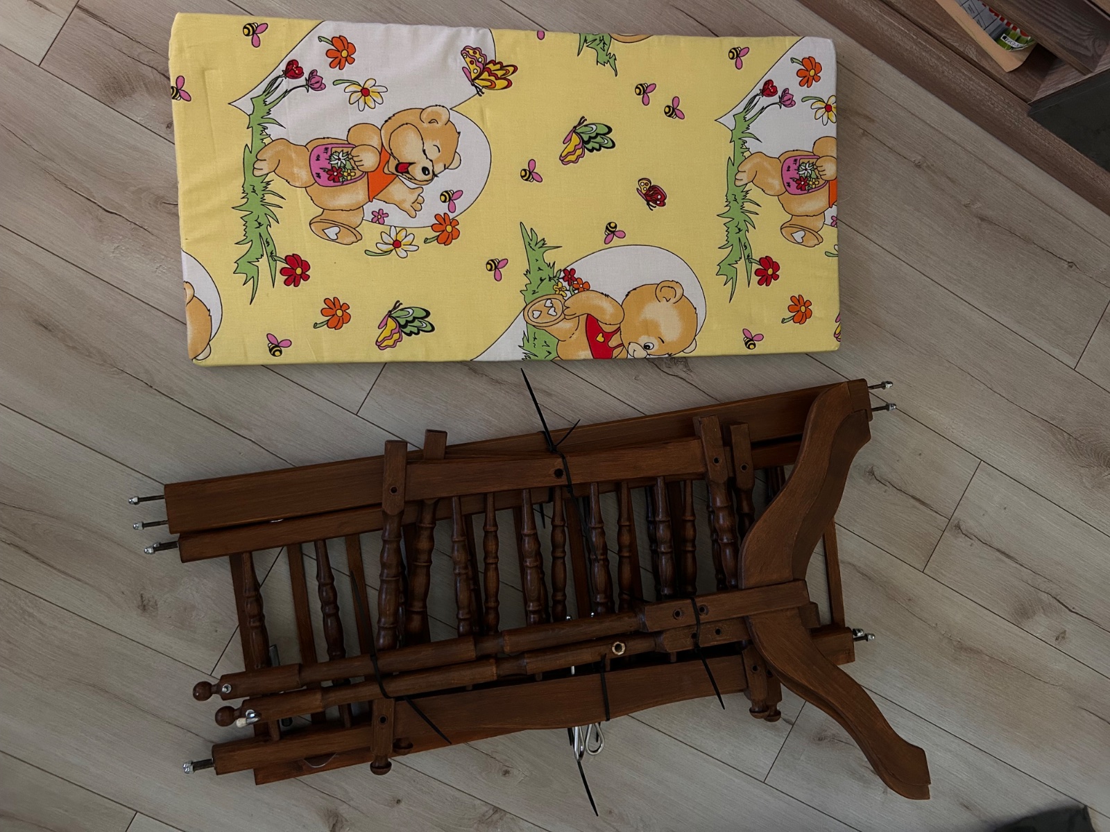 Kolíska je z dreva,bez akéhokoľvek poškodenia.matrac k nemu je nepoužívaný.rozmery matraca na fotkách,rozmery kolísky:85x50x90 (dĺžka x šírka x výška).