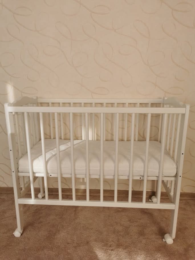 Postieľka bielej farby, ideálne aj ako "prirazenie " k manželskej posteli, ak sa odstráni jedna bočnica (je tam prirobeny este aj kraj k postelí).Predávame spolu s baldachýnom, mantinelom a matracom. My sme ju vlastne reálne použili týždeň, inak sme ju mali len pri posteli, aby malá nespadla z manželskej postele :) Niektoré kraje postielky sú mierne ošúchané.
