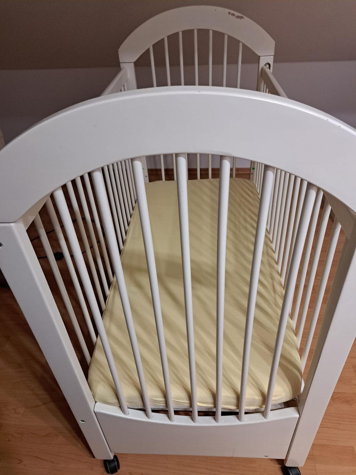 Ponúkam detskú postieľku so sťahovacou bočnicou (na kolieskach) vrátane matraca - matrac bol menený - nový, bol používaný cca 2 mesiace.
