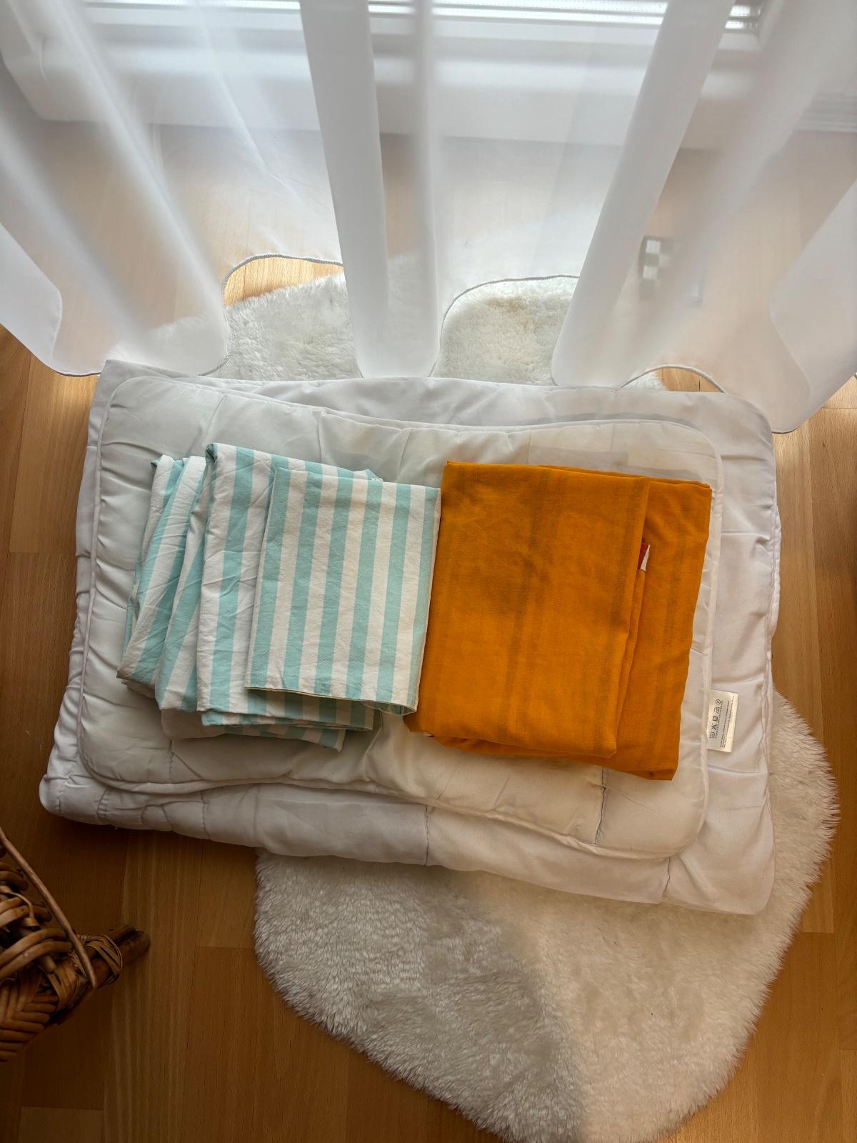 Vankusik a perina do posielky. Vankus cca 60x40, perina 90x140 problizne. K tomu 2x obliecky. Oranzove- z druhej strany pasiky. Matove- zdruhej strany sovicky. Cista Bavlna. Super stav bez skvrn. Len vsetko spolu prosim. Cena symbolicka, nemam uz miesto.