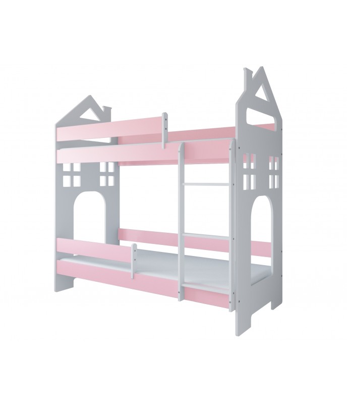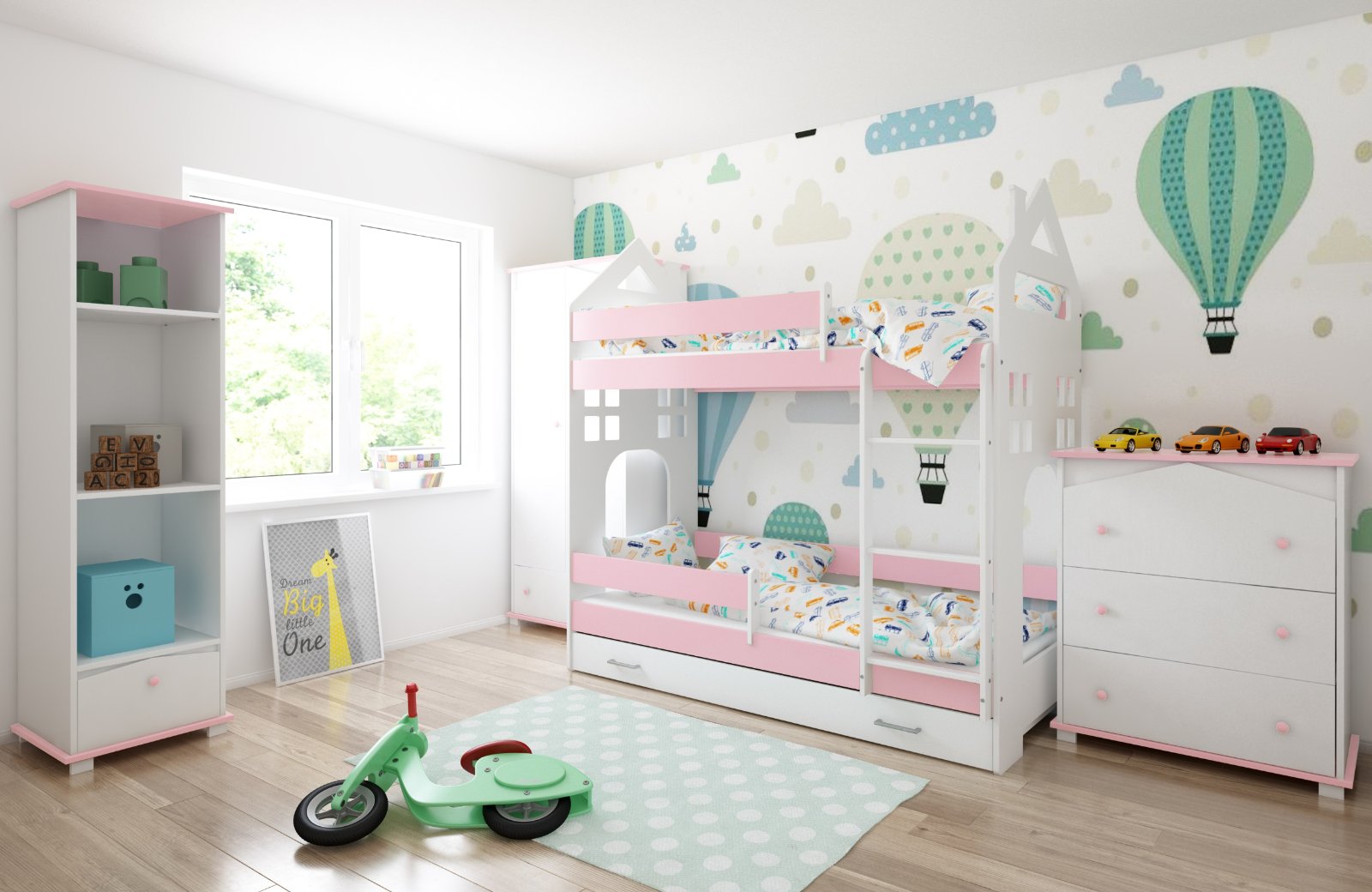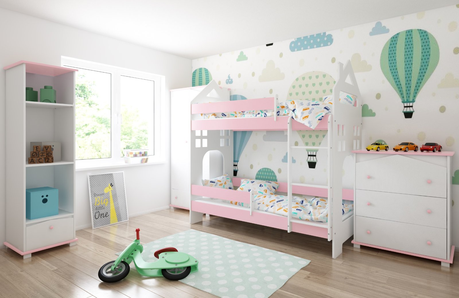 Detská poschodová posteľ v tvare domčeka spĺňa estetickú aj praktickú funkciu zariadenia detskej izby.