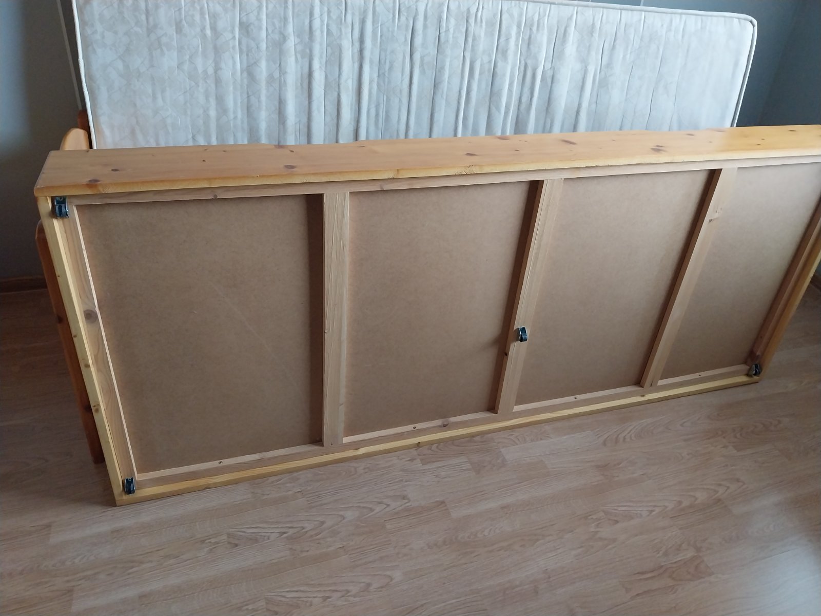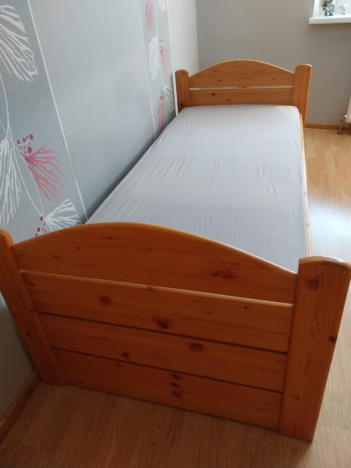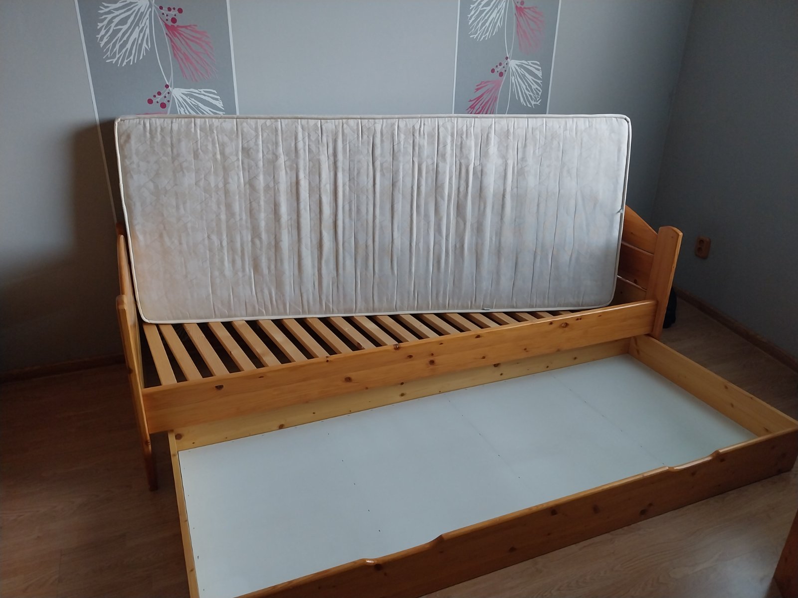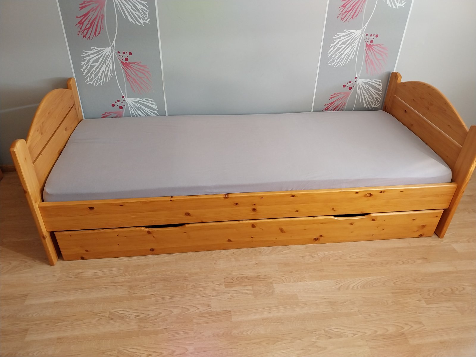 Posteľ z masívneho dreva s roštom, matracom a úložným boxom.