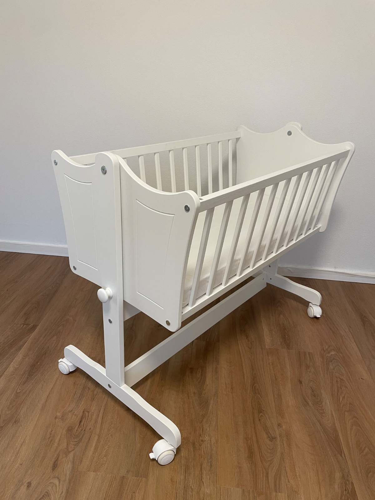 Kolíska má kolieska na ľahký presun a funkciu blokovania kolísania.