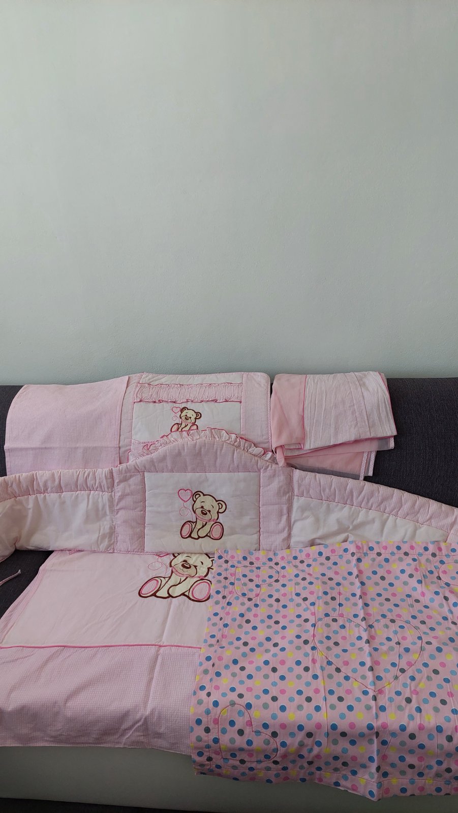 Vankúšik, paplónik, návliečka na vankúšik (z jednej strany žltý fľak, viď foto) 55x38, na paplónik 90x120, mantinel, baldachýn, vreckár, bodkovaná podložka alebo ako prikrývka. Osobný odber alebo dohoda.
