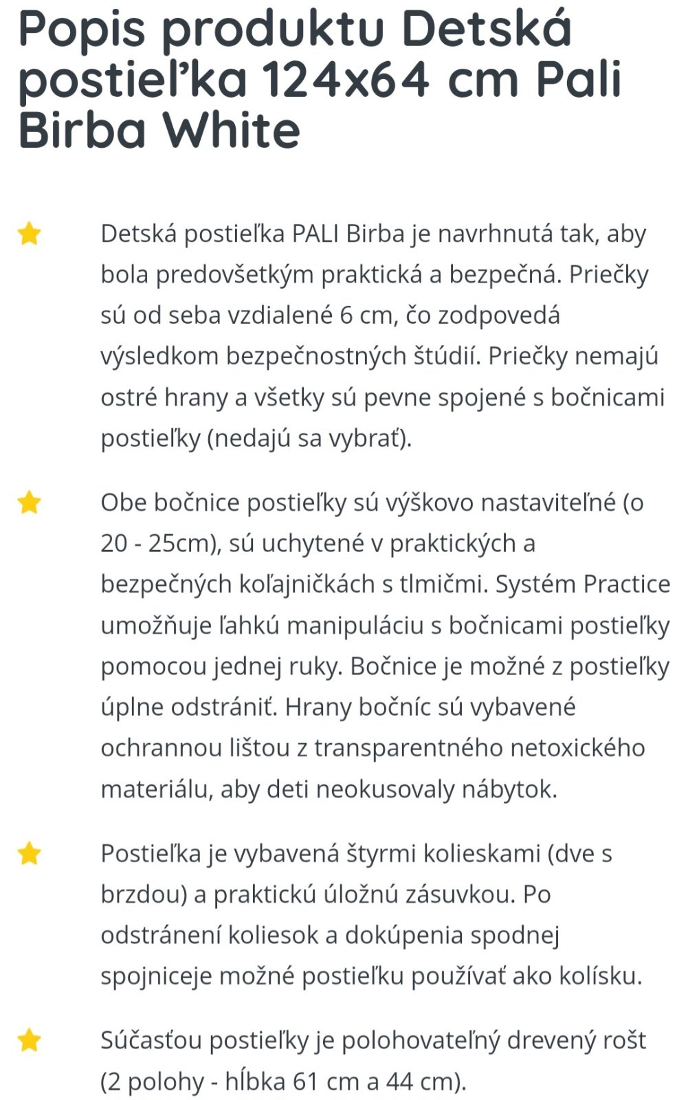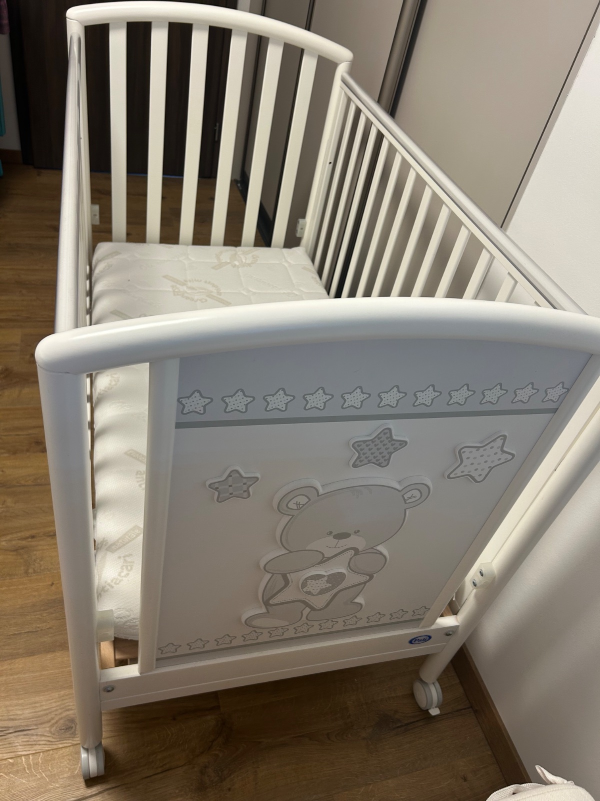 Nadherna postielka Pali bez poskodenia. Kupovana ako nova pouzivana jednym dietatkom cca 1,5 roka. Ma 3 polohy pre leziace babatko, trochu hlbsie ked kolenackuje a najhlbsie ked stala. Matrac je ako novy bez poskodenia, mala tam iba v noci spinkavala. Viac info je v prilozenych fotkach kde je oficialna specifikacia. Nova stoji okolo 230 eur.