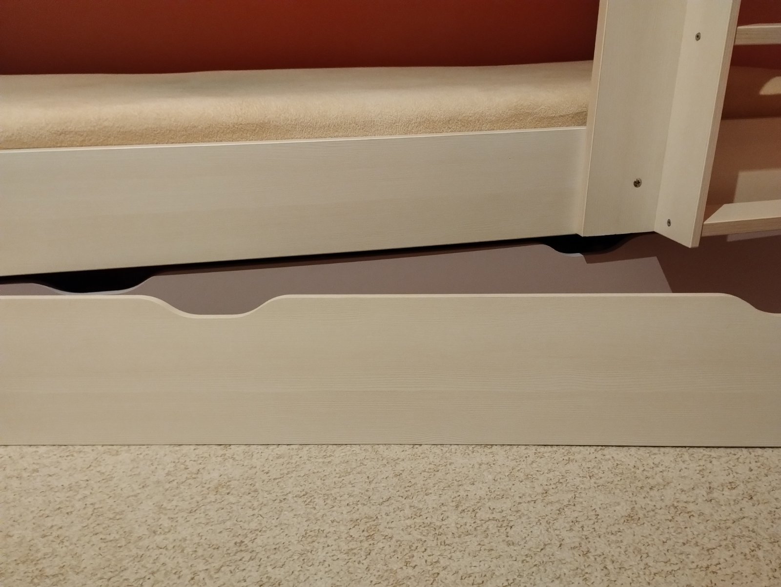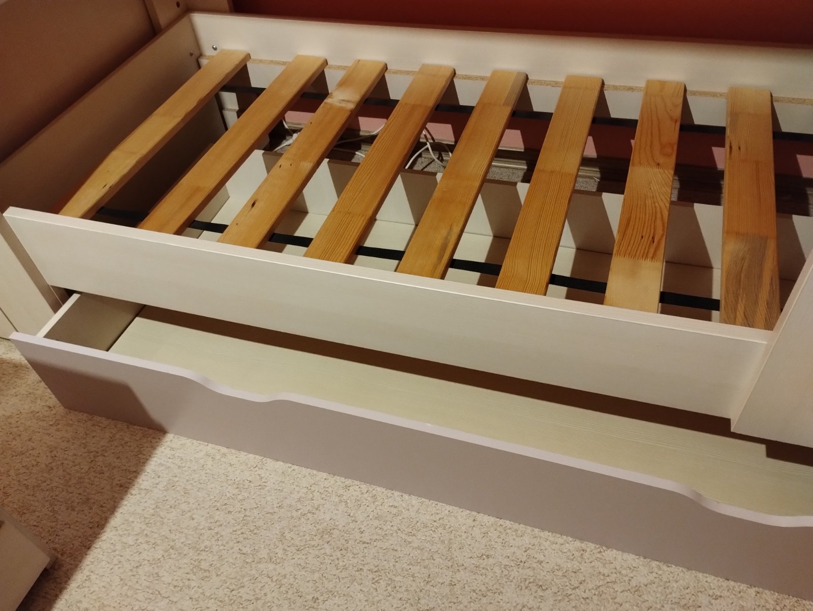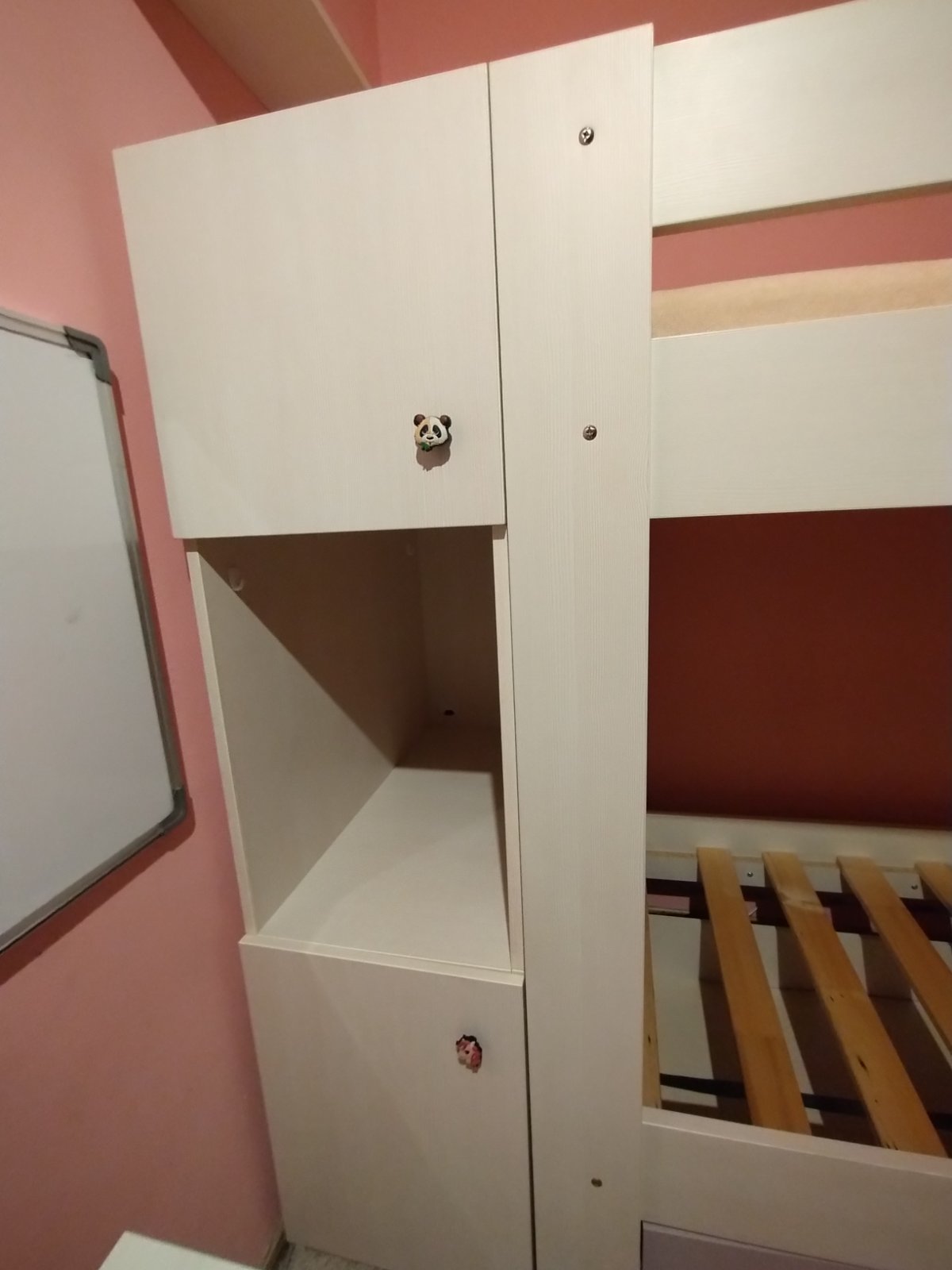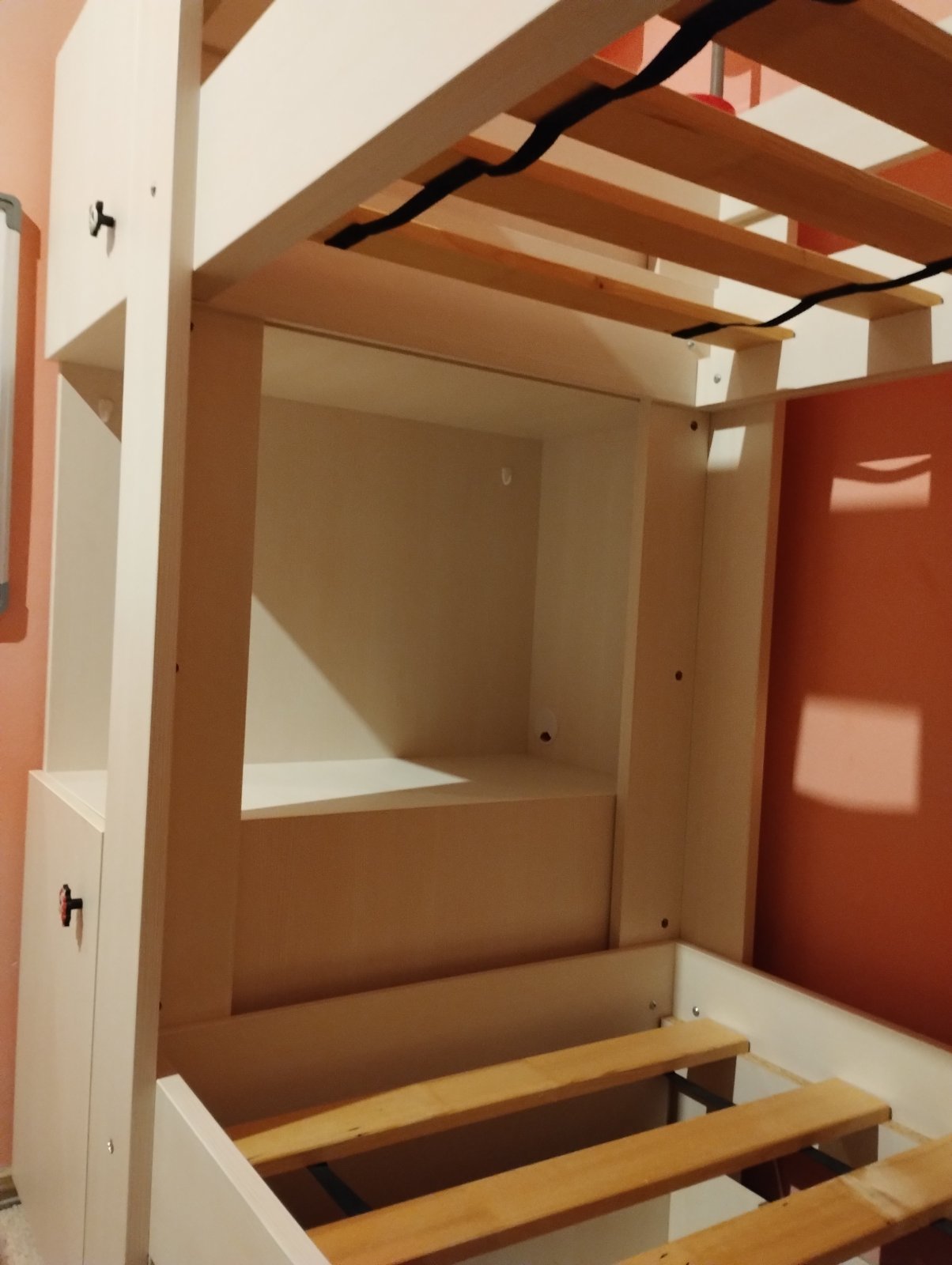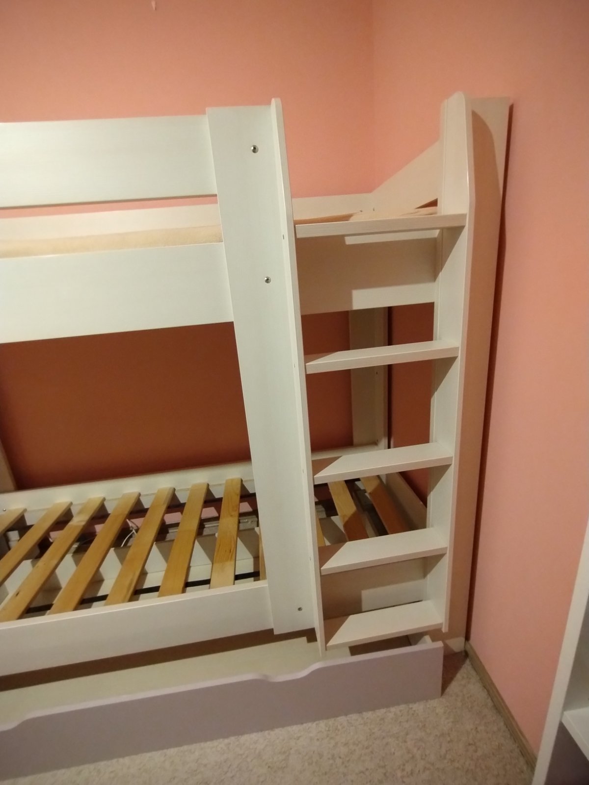 Predám zachovalú poschodovú posteľ s úložným priestorom od Slovenského výrobcu Drevona a skrinkou vedľa postele. Farba biela, čelo šuplíka ružové (Rose), ale je možnosť vymeniť za biele. Skrinka vyrobená na mieru pre využitie priestoru vedľa postele, slúžila aj ako nočné stolíky. Rozmery: výška 167cm, šírka 90cm, dĺžka postele + skrinka 209x43cm, lôžko 80x200cm. Priestor medzi posteľami 82cm. Posteľ sa predáva s roštmi bez matracov. Posteľ používaná cca 4 roky. Cena: 400,- ale viem s aj dohodnúť :-)