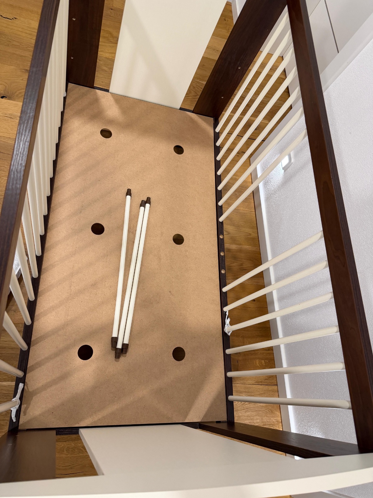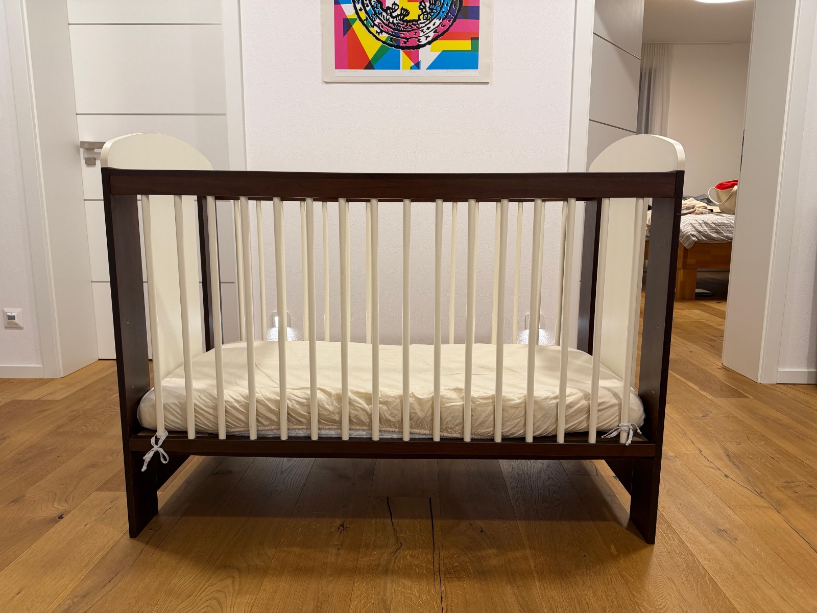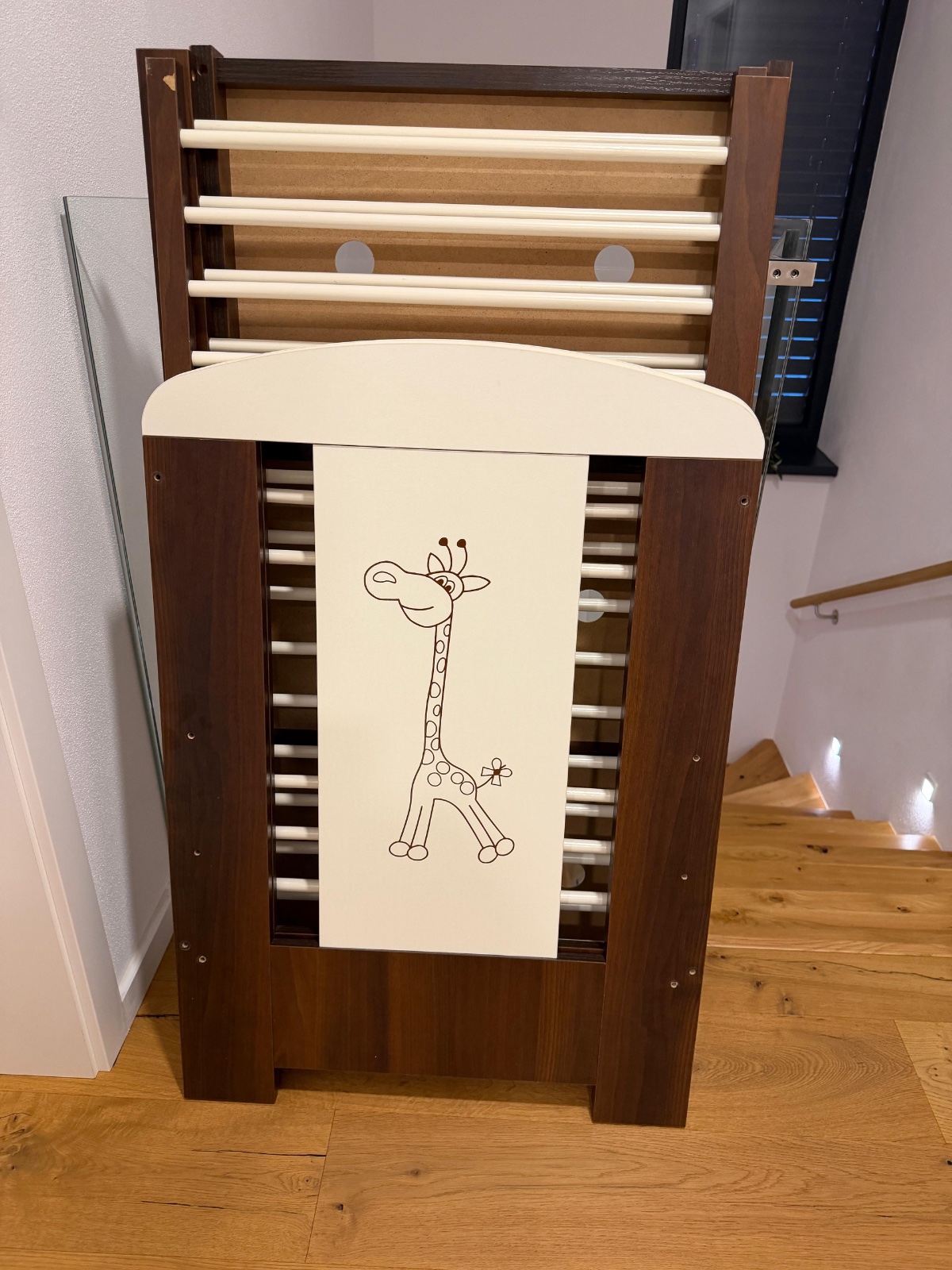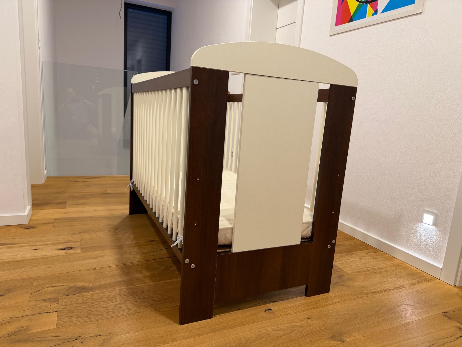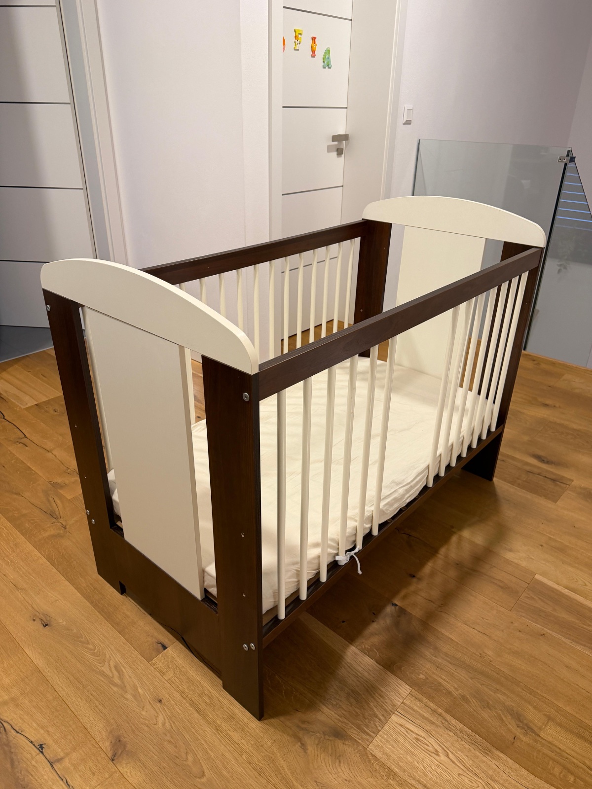 Hnedo- biela detská postieľka v top stave, nastaviteľná na 3 výšky, z boku vyberateľné 3 tyčky.