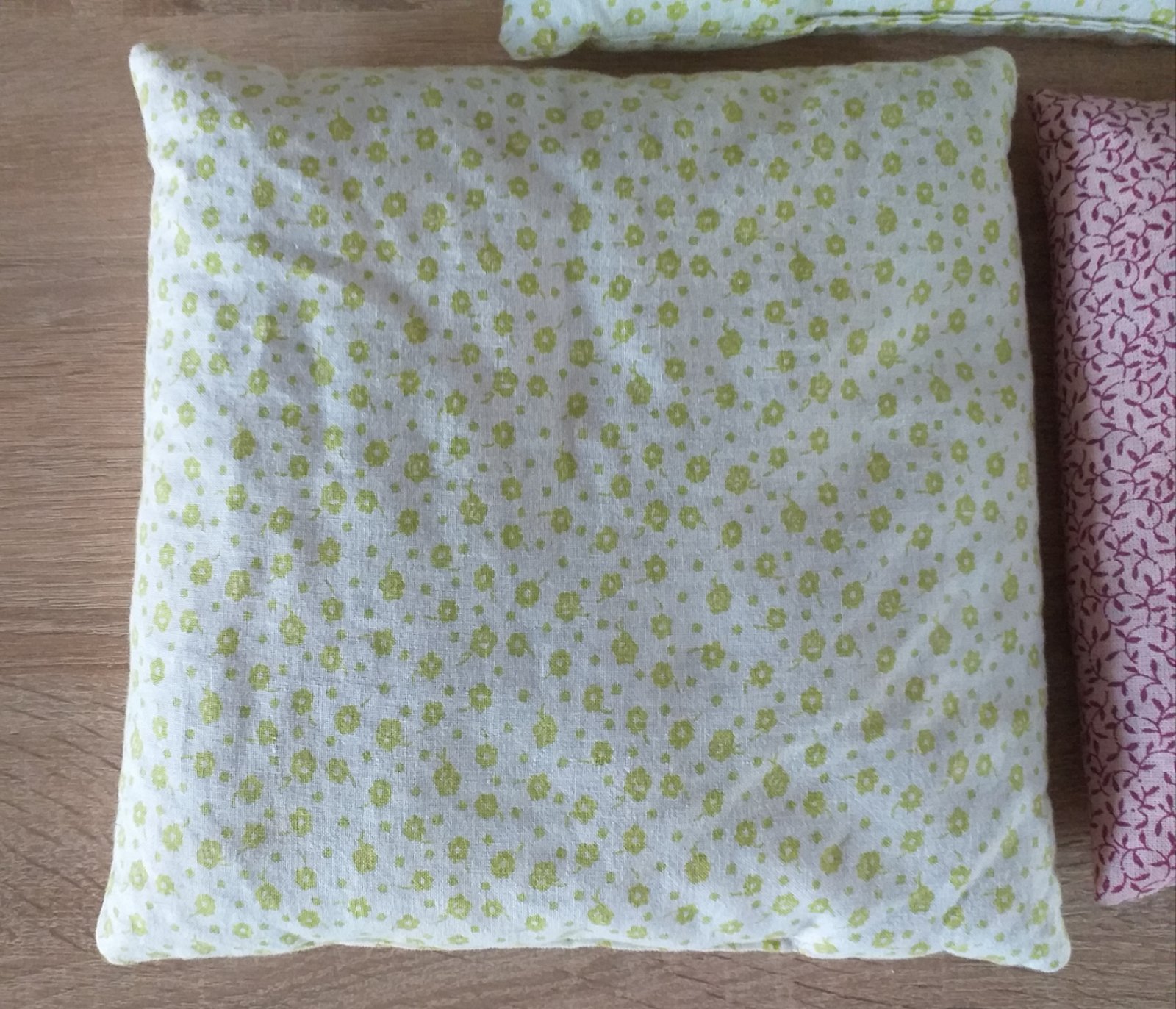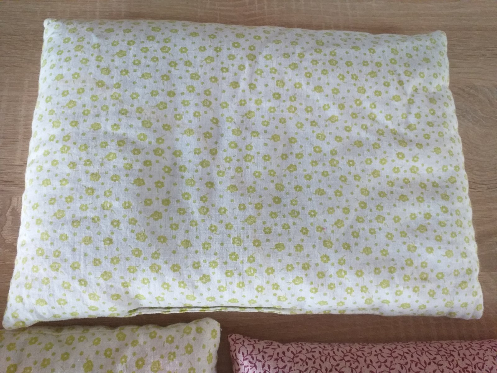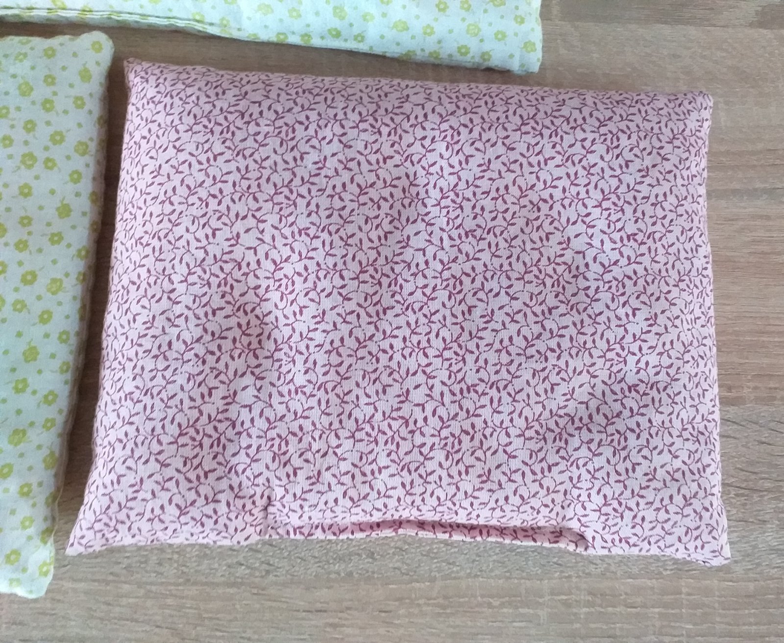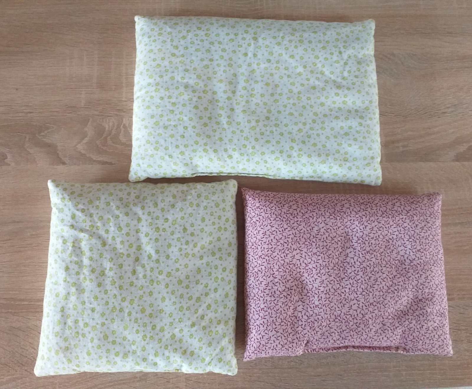 Nepoužívané handmade vankúšiky, vrchný materiál 100% bavlna, vnútri vyplnené špaldovými šupkami. Vhodné na nahrievanie pri kolikách, bolestiach. Rozmery: väčší zelený 34 x 24 cm, menší zelený 24 x 24 cm, ružový 27 x 21 cm. Cena 2 eur za jeden, všetky spolu za 5 eur.
