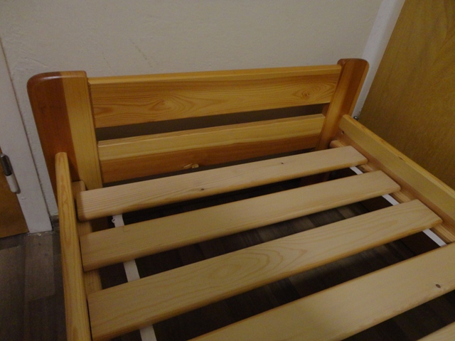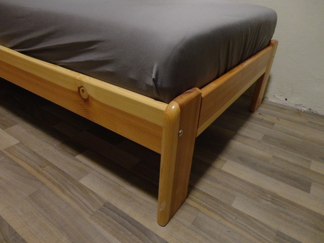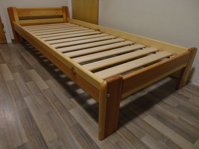 Jednolôžková, drevená konštrukcia z masívu – svetlé drevo (borovica/smrek), ošetrená lakom, oblé hrany, nízke čelo, pevná a stabilná, nosnosť: 120 kg.