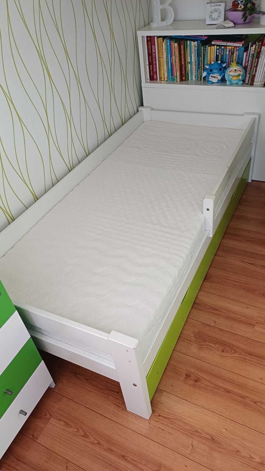 Predam malo pouzivanu postel. Matrac je novy, nepouzivany. Postel predavam s rostom, s uloznym priestorom a matracom. Na posteli vidno sktrukturu dreva, ktora vychadza z pod farby. Nie je to zosuchane, je to od zaciatku. Ochrannu barieru z predu si viete dat prec, pripadne navolit stranu podla potreby. Cena spolu 150 Eur.