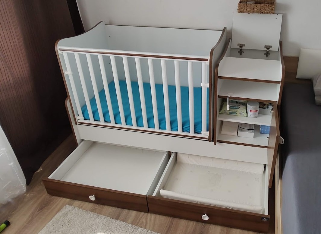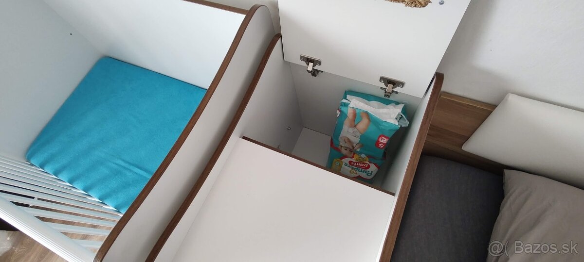 Komoda s prebalovacím pultom je pevne spojená s postieľkou a disponuje viacerými odkladacími priestormi, pričom dva veľké výsuvné šuplíky na koľajniciach sa nachádzajú pod postieľkou (nehrozí poškriabanie podlahy).