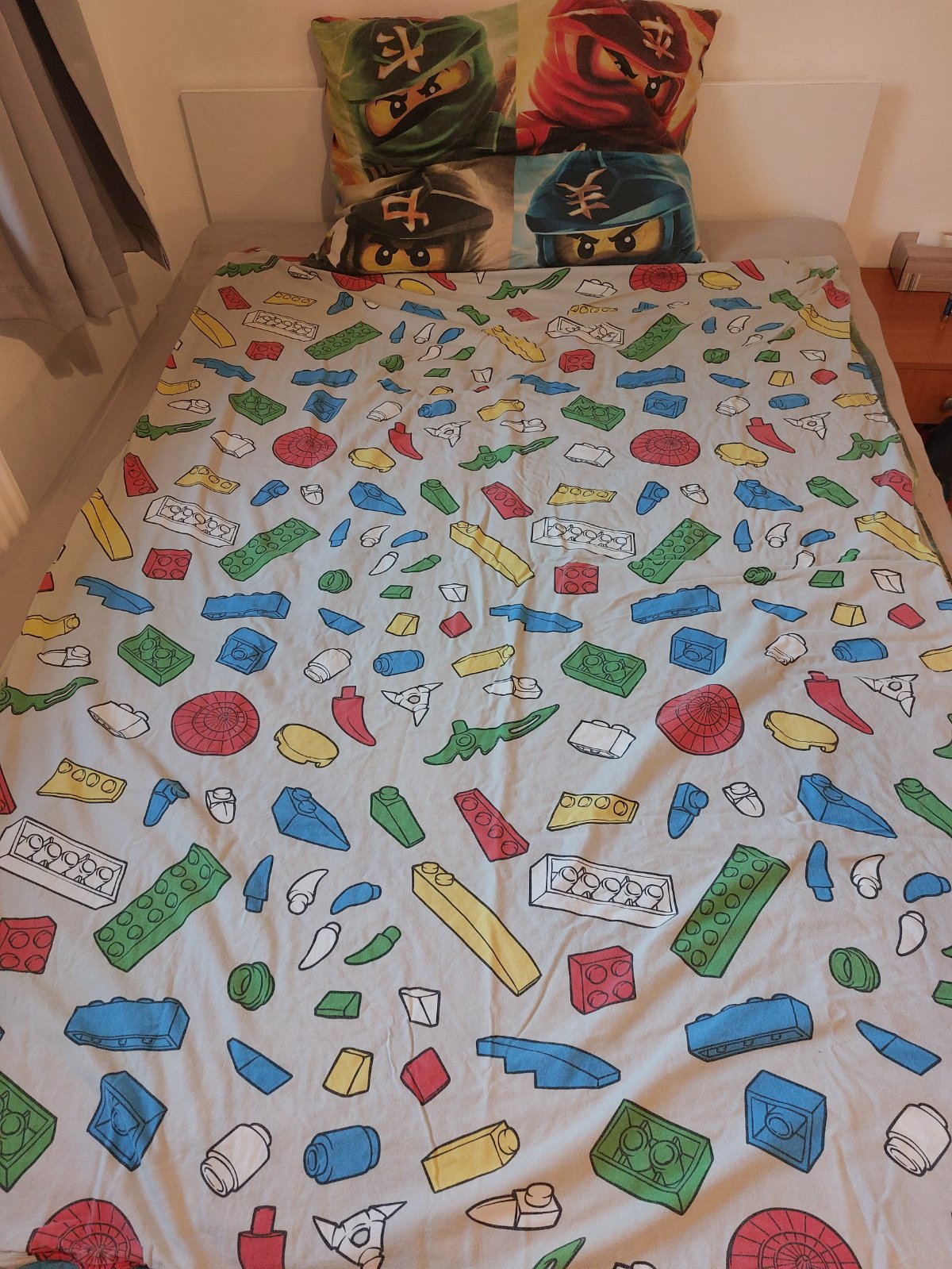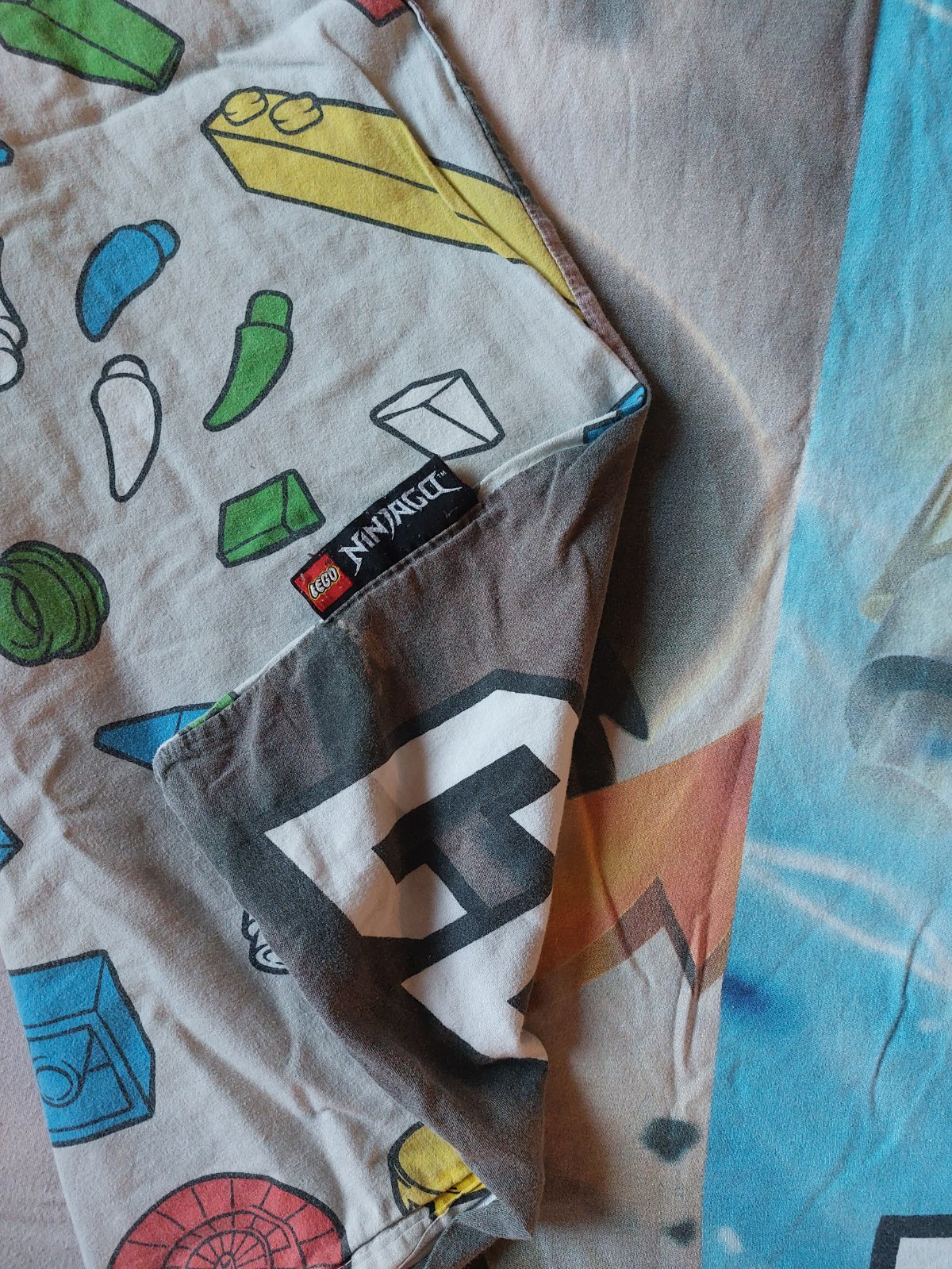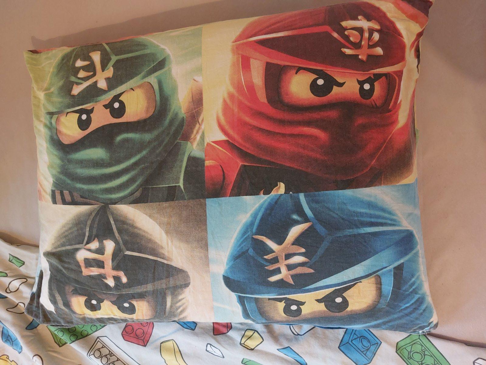 Posteľná bielizeň na veľkú posteľ s motívom Lego Ninjago. Zapínanie za zips. Obliečka na vankúš je z oboch strán rovnaká, na perinu z jednej strany Lego kocky, z druhej panáčiky.