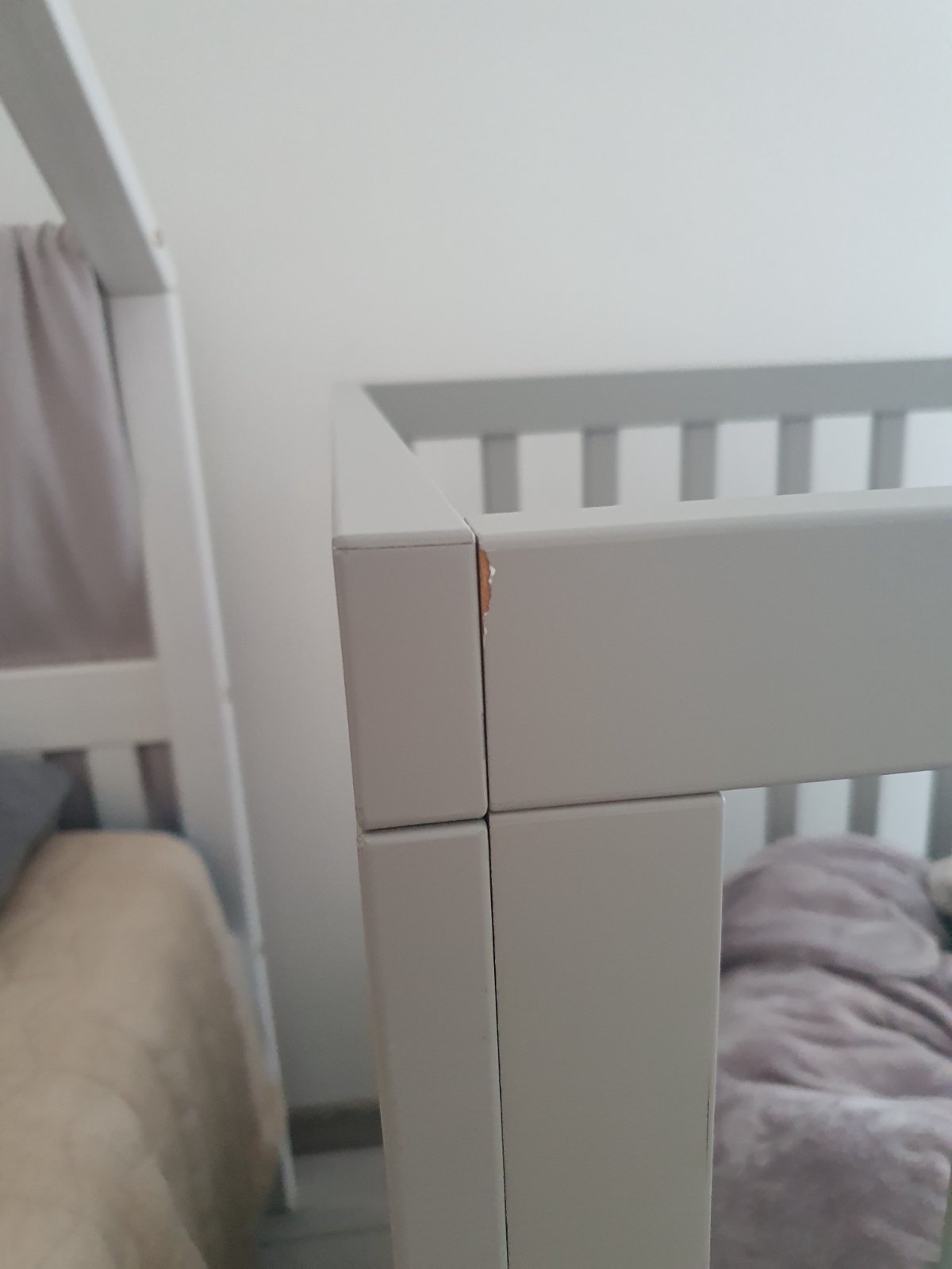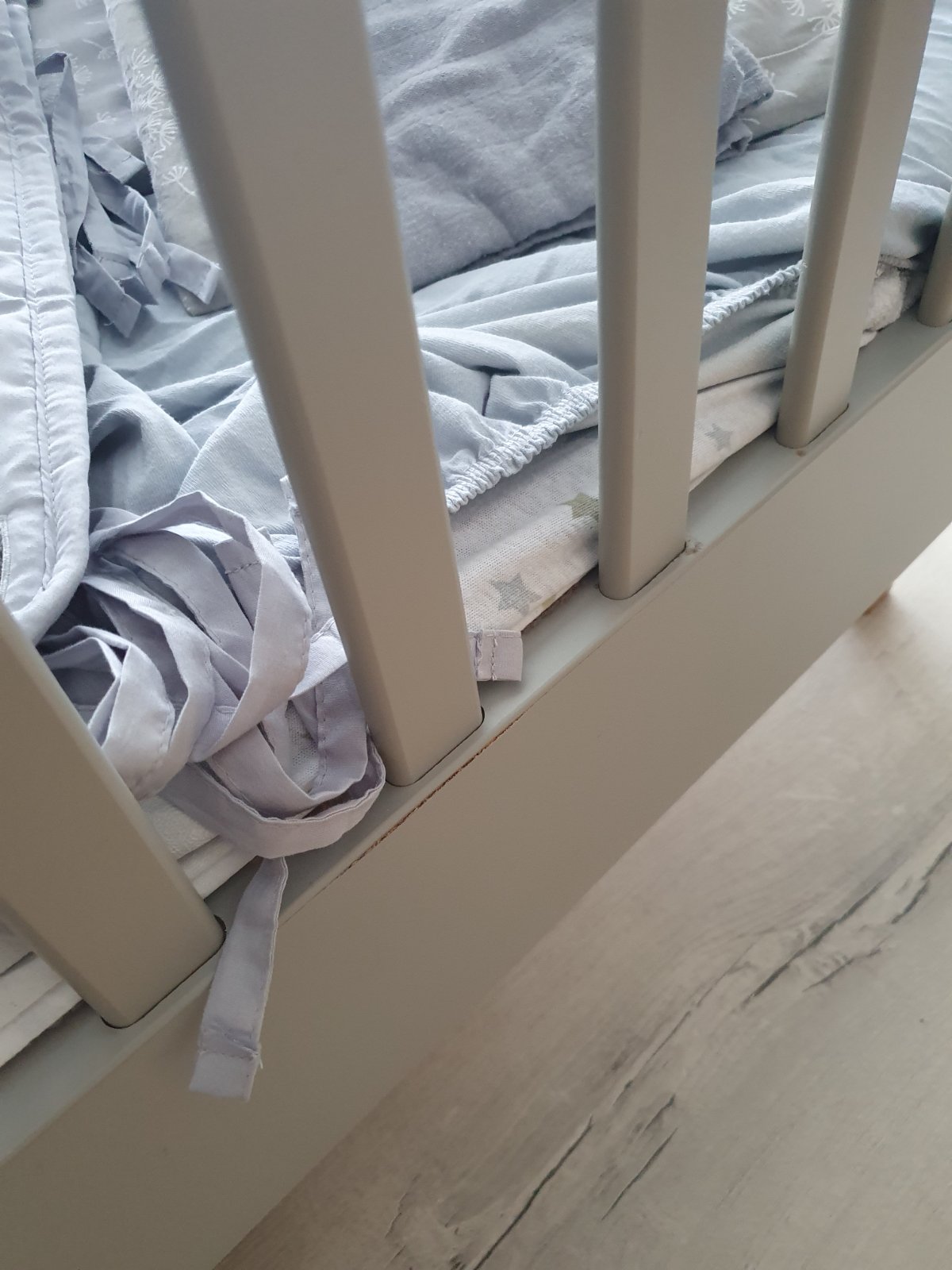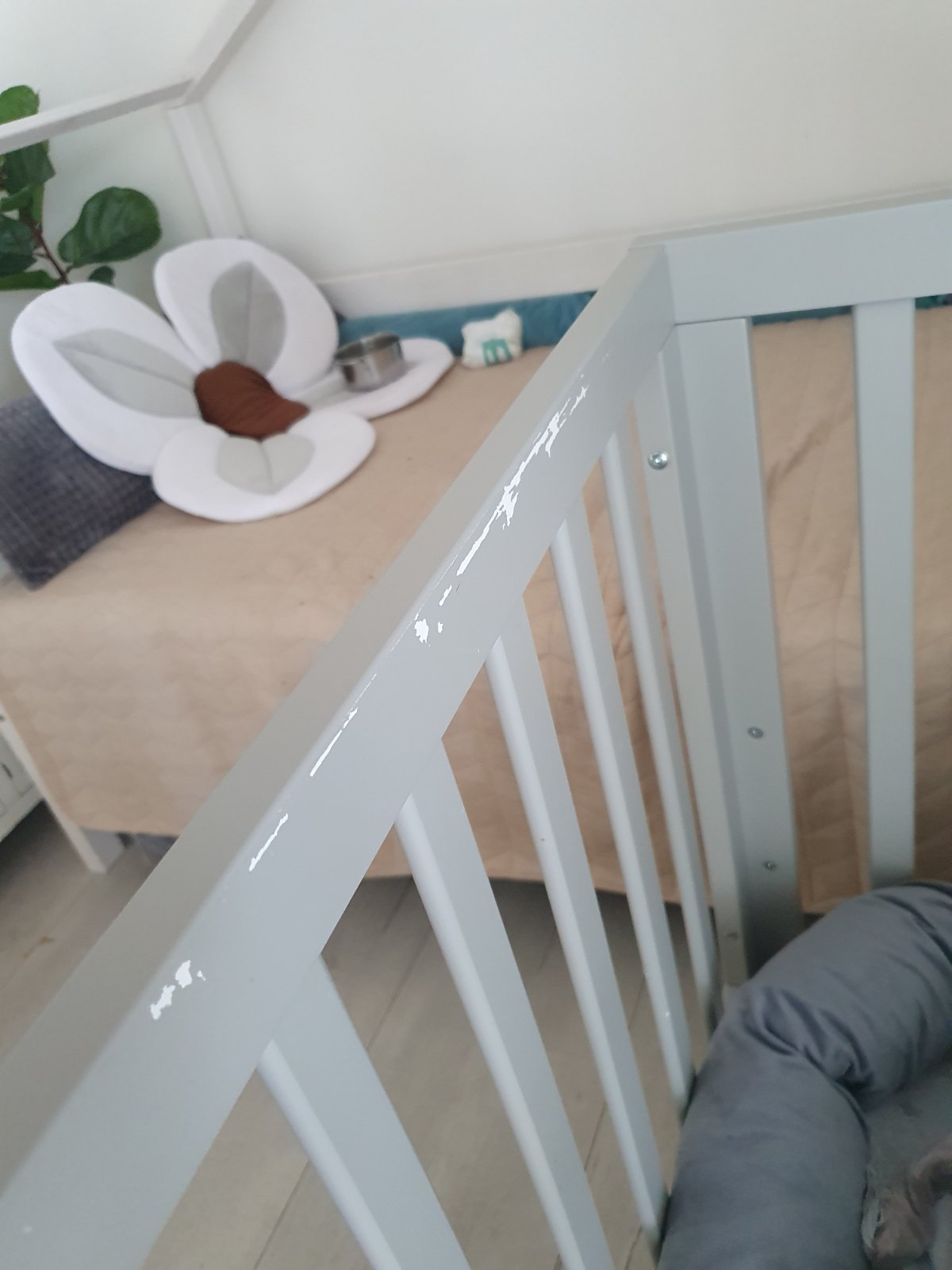 Postieľka prešla obdobím prerezávania zúbkov a hrkálkovania takže má po tomto období "jazvy" - výhodou kúpy za bazárovú cenu je, że ak budę prechadzat znova tymito obdobiami a mała by zazit este nejake skrabance su firmy ktore vedia nadherne nabytok prelakovat aj v inej zelanej farbe a teda na druhe obdobie do 5.rokov, kedy postielka może fungovat beż dvoch dlhych bocnic, ju budete mat ako o5 novu :)