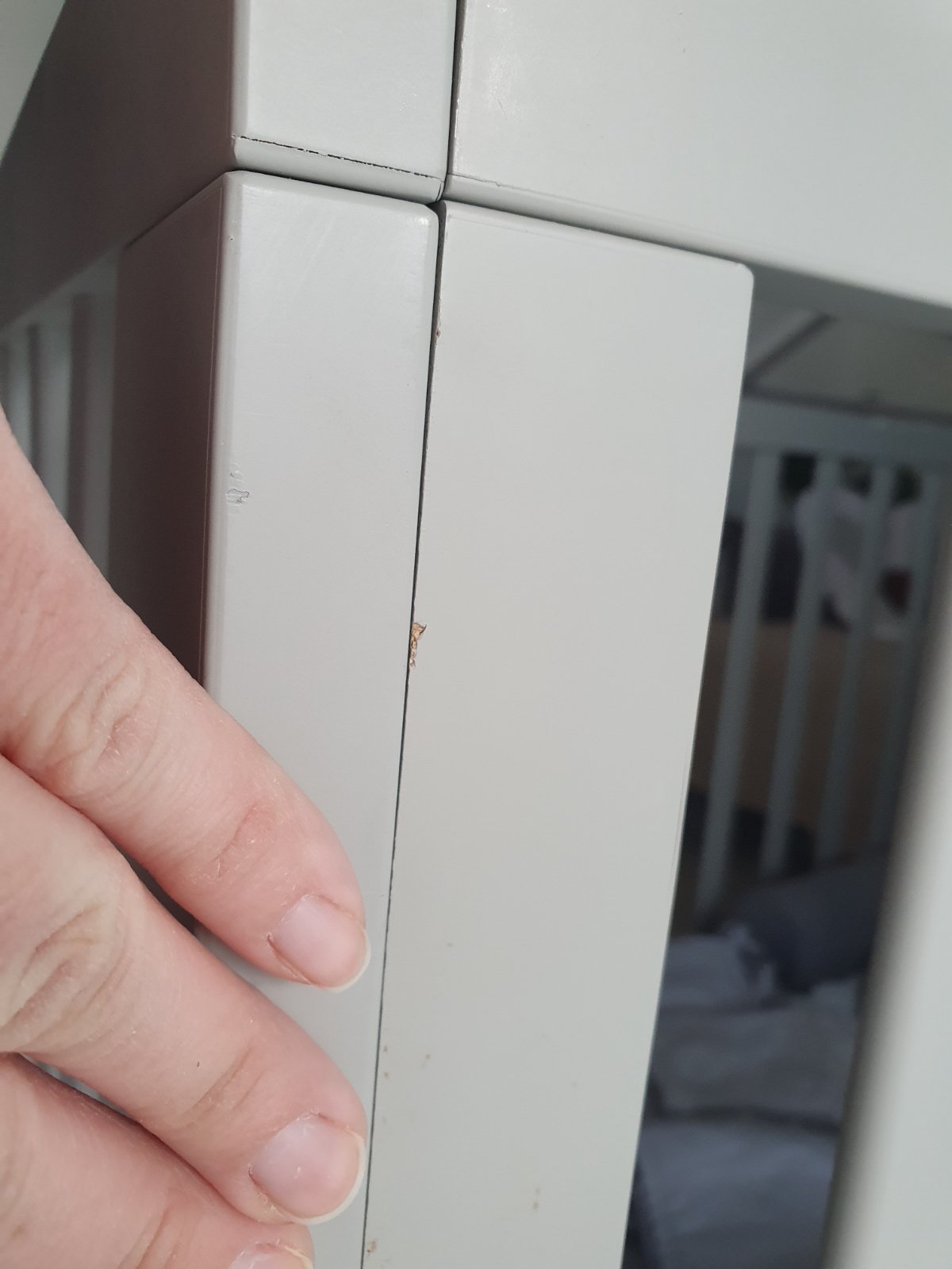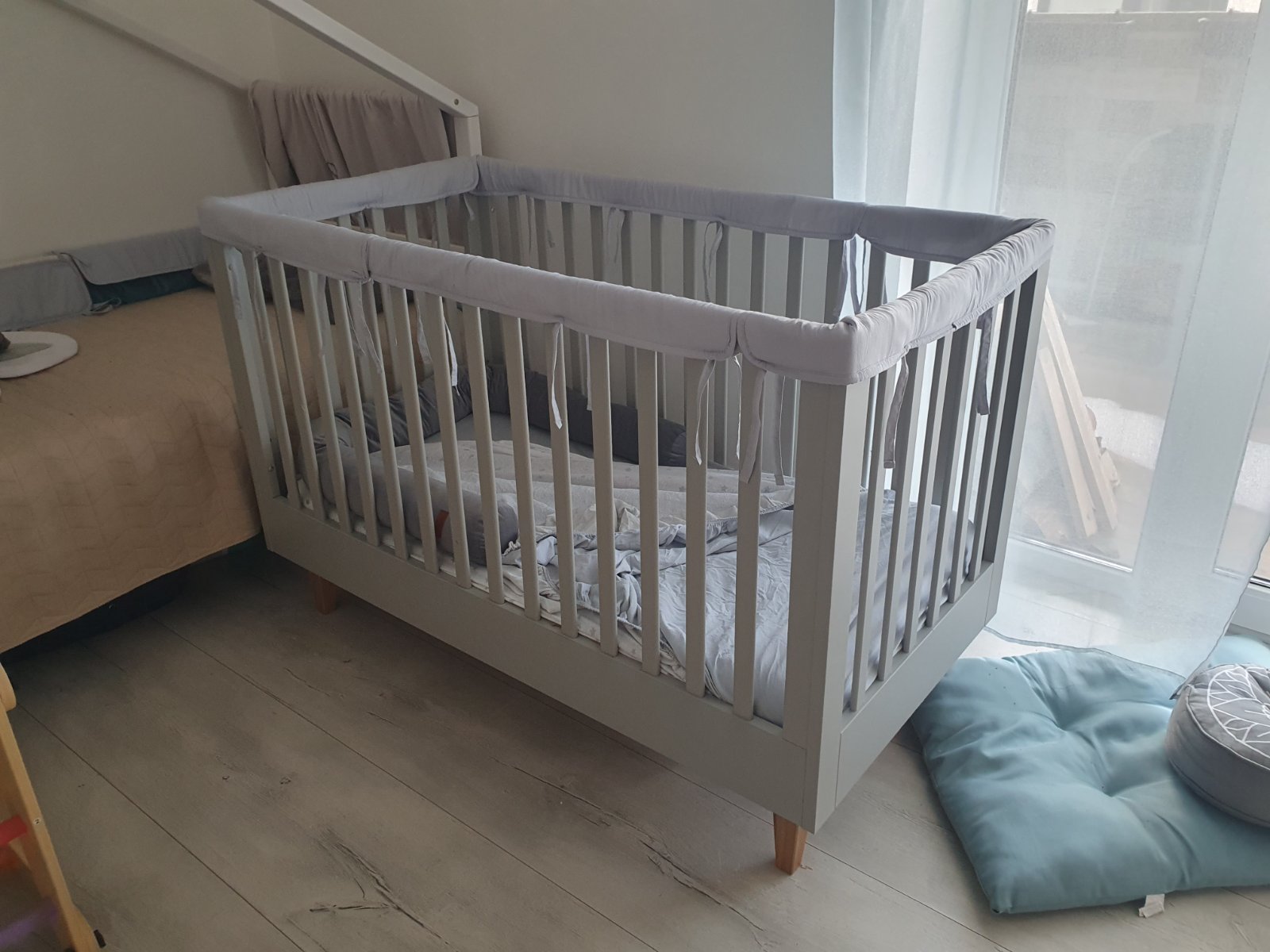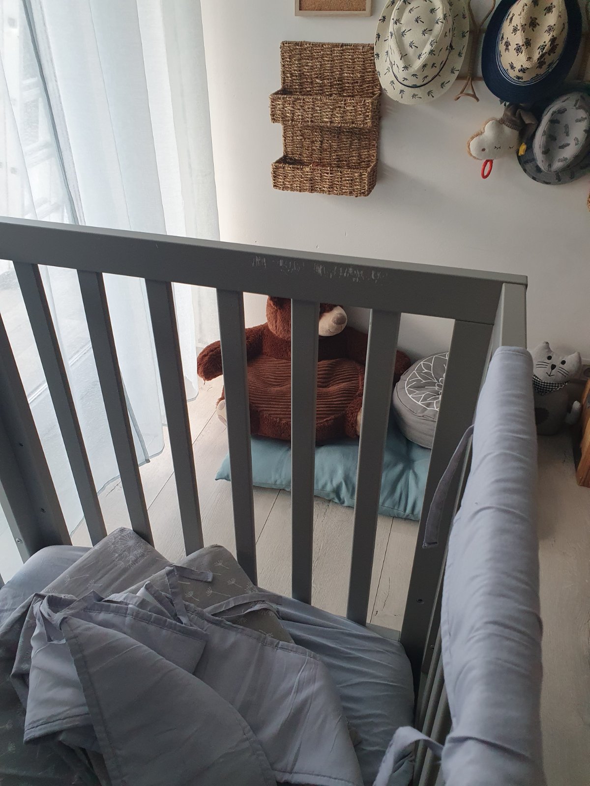 Postieľka prešla obdobím prerezávania zúbkov a hrkálkovania takže má po tomto období "jazvy" - výhodou kúpy za bazárovú cenu je, że ak budę prechadzat znova tymito obdobiami a mała by zazit este nejake skrabance su firmy ktore vedia nadherne nabytok prelakovat aj v inej zelanej farbe a teda na druhe obdobie do 5.rokov, kedy postielka może fungovat beż dvoch dlhych bocnic, ju budete mat ako o5 novu :)