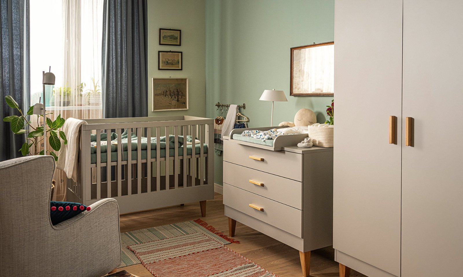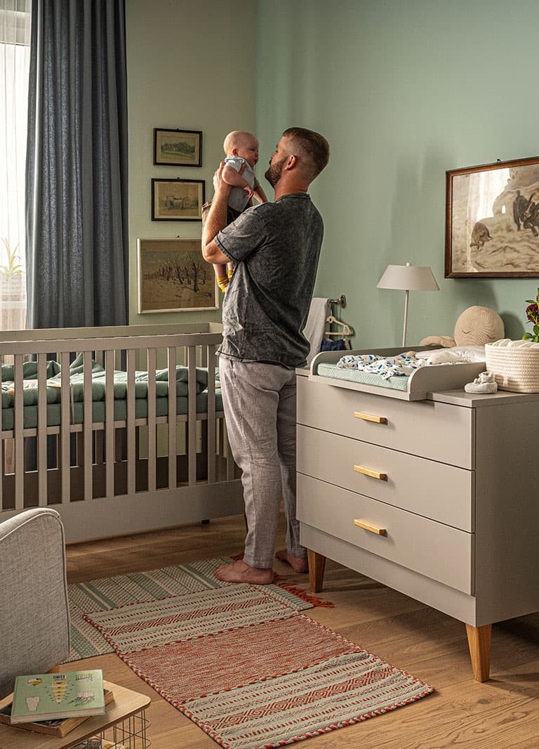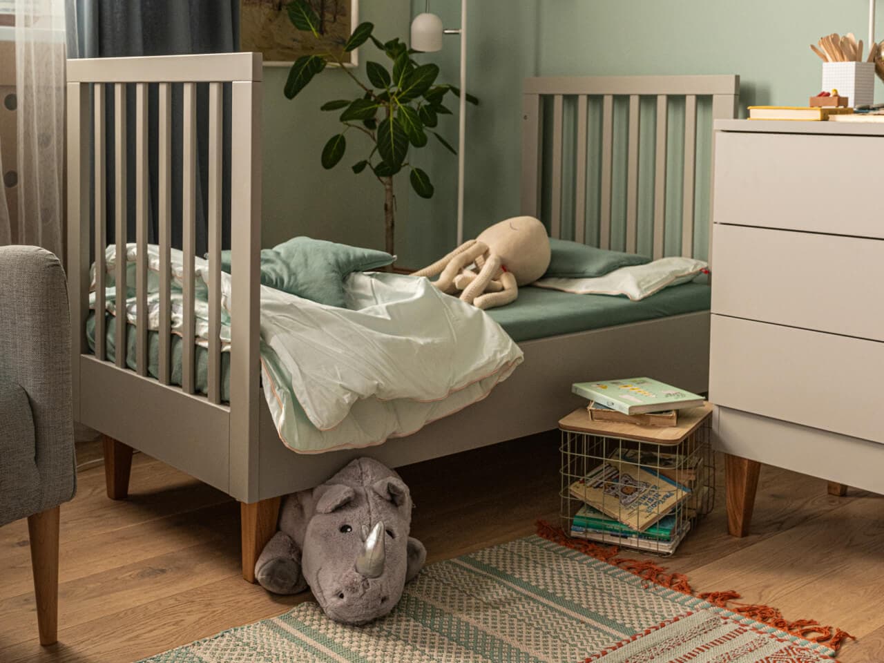 Funkčnosť: Nábytok je navrhnutý s ohľadom na rast dieťaťa, postieľka má nastaviteľnú výšku podlahy a dá sa premeniť na väčšiu (70x140 cm).